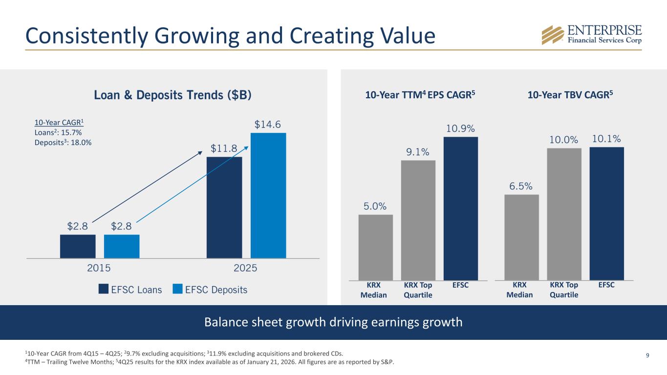 8 Strategic Growth Pillars Well positioned in attractive markets Differentiated deposit verticals Focused loan growth strategies High-quality talent additions through focused efforts Best-in-class technology  Strong presence across major markets, balancing stable Midwest anchors (St. Louis, Kansas City) with high-growth Southwest and Western MSAs (Phoenix, Dallas, Los Angeles)  Scalable platform with meaningful opportunities for growth and market share gains  Specialized funding across three verticals including community associations, property management and legal/escrow  High-retention, low-cost deposits that complement traditional retail banking network  Four distinct lending verticals including SBA (top 25 national ranking), life insurance premium finance, sponsor finance and tax credit programs  Lending verticals provide a competitive advantage, risk-adjusted pricing, and fee income opportunities  Opportunistically added 29 high-performing producers since 2021 to increase density in core focus geographies  Bolstered capabilities in Los Angeles (11 hires), San Diego (10 hires), Phoenix/Las Vegas (5 hires) and Texas (3 hires) to increase market penetration in high- value market corridors  End-to-end digital lifecycle that supports the full client journey from onboarding to growth  Integrating artificial intelligence and fintech partnerships to optimize internal workflows and enhance the client experience Relationship-driven community banking DNA with scalable national lending and deposit gathering expertise, utilizing premier talent and technology to capture opportunity across a balanced footprint of stable and high-growth markets