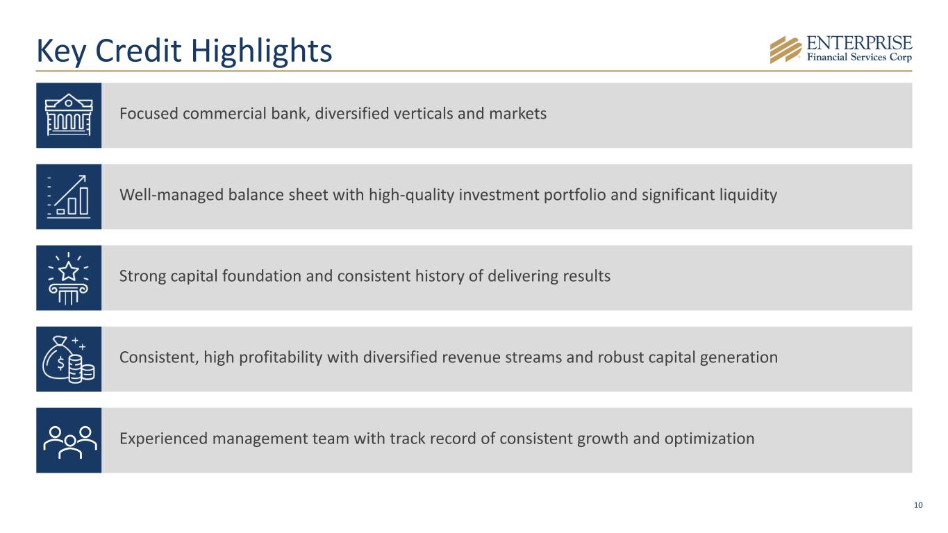 9 Balance sheet growth driving earnings growth 10-Year TBV CAGR510-Year TTM4 EPS CAGR5 110-Year CAGR from 4Q15 – 4Q25; 29.7% excluding acquisitions; 311.9% excluding acquisitions and brokered CDs. 4TTM – Trailing Twelve Months; 54Q25 results for the KRX index available as of January 21, 2026. All figures are as reported by S&P. 10-Year CAGR1 Loans2: 15.7% Deposits3: 18.0% KRX Median KRX Top Quartile EFSC KRX Median KRX Top Quartile EFSC Consistently Growing and Creating Value