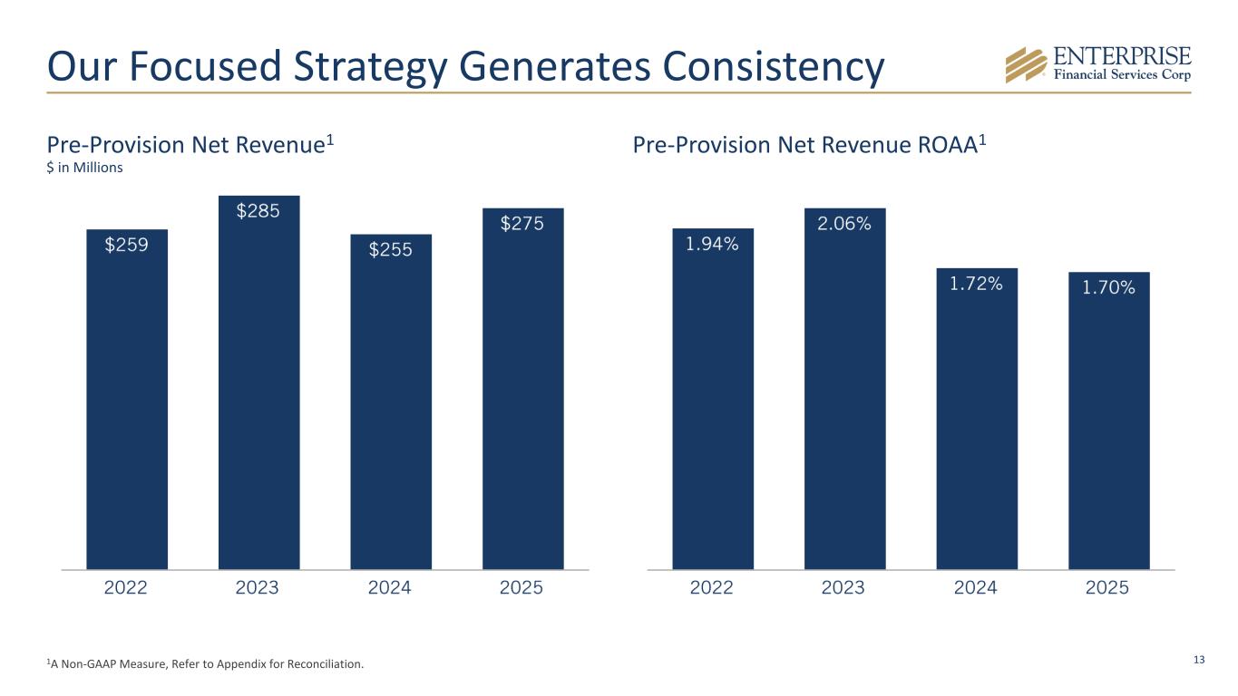 12 Financial Highlights - 4Q25* *Comparisons noted below are to the linked quarter unless otherwise noted. **A Non-GAAP Measure, Refer to Appendix for Reconciliation. • Net Income $54.8 million, up $9.6 million; diluted EPS $1.45 • Net Interest Income $168.2 million, up $9.9 million; NIM 4.26% • ROAA 1.27%, compared to 1.11%; PPNR ROAA** 1.74%, compared to 1.61% • ROATCE** 14.02%, compared to 11.56% Earnings Capital • Tangible Common Equity/Tangible Assets** 9.07%, compared to 9.60% • Tangible Book Value Per Common Share** $41.37, compared to $41.58 • CET1 Ratio 11.6%, compared to 12.0% • Quarterly common stock dividend of $0.32 per share in fourth quarter 2025 ($0.01 increase) • Quarterly preferred stock dividend of $12.50 per share ($0.3125 per depository share) • Repurchased 67,000 shares at an average price of $52.64 M&A • Completed branch acquisition in Arizona and Kansas in October 2025 Loans & Deposits • Loans $11.8 billion, up $217.2 million (down $74.7 million excluding acquired loans) • Deposits $14.6 billion, up $1.0 billion or $1.1 billion excluding brokered CDs ◦ Deposits up $431.9 million excluding acquired deposits Asset Quality • Nonperforming Loans/Loans 0.70%; Nonperforming Assets/Assets 0.95% • Allowance Coverage Ratio 1.19%; 1.29% adjusted for guaranteed loans** • Net Charge-Offs $20.7 million • $6.2 million gain on OREO