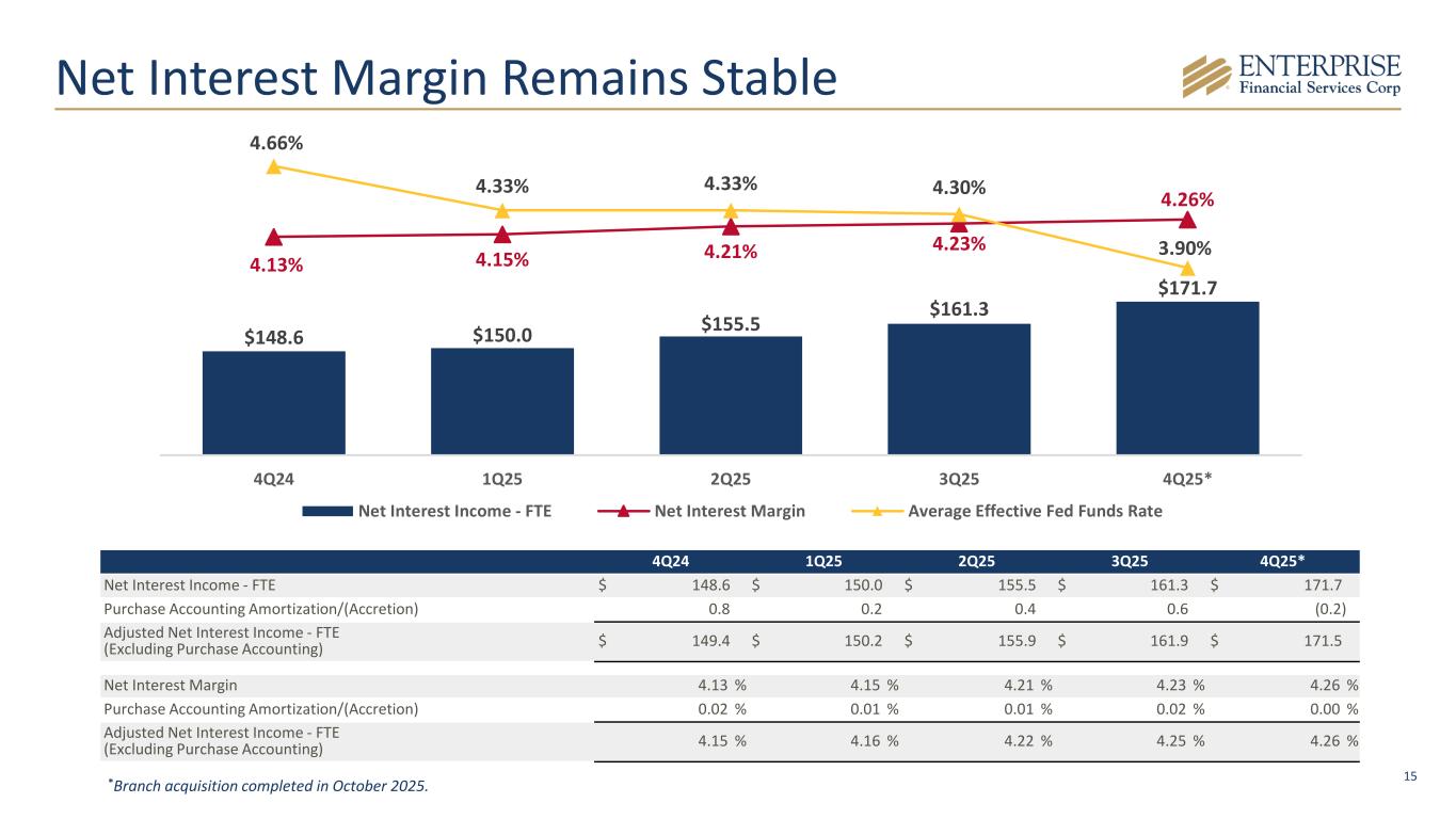14 Note: Peers represent major exchange traded banks with assets $10 billion - $25 billion; excludes FBP, LC, OFG, merger targets and banks with negative profitability or missing data. Peer data per S&P Capital IQ Pro. 1Non-GAAP measure, refer to appendix for reconciliation. 2Defined as ROATCE x (1 - dividend payout ratio). Profitability is Driving Strong Capital Generation… With a Flexible and Well-Structured Balance Sheet Positioned for Consistent Growth 2025Y PPNR ROAA1 2025Y NIM 2025Y Equity Retention Rate2 Loans / Deposits EFSC Banks $10B - $25B 0.59% 1.70% 2.80% 2.45% 4.21% 4.51% 1% 10% 15% 102% 81% 61%