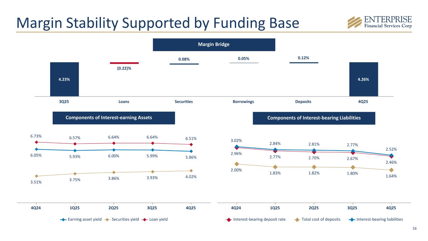 15 Net Interest Margin Remains Stable $148.6 $150.0 $155.5 $161.3 $171.7 4.13% 4.15% 4.21% 4.23% 4.26% 4.66% 4.33% 4.33% 4.30% 3.90% 2.50% 3.00% 3.50% 4.00% 4.50% $100.0 $120.0 $140.0 $160.0 $180.0 $200.0 $220.0 $240.0 4Q24 1Q25 2Q25 3Q25 4Q25* Net Interest Income - FTE Net Interest Margin Average Effective Fed Funds Rate 4Q24 1Q25 2Q25 3Q25 4Q25* Net Interest Income - FTE $ 148.6 $ 150.0 $ 155.5 $ 161.3 $ 171.7 Purchase Accounting Amortization/(Accretion) 0.8 0.2 0.4 0.6 (0.2) Adjusted Net Interest Income - FTE (Excluding Purchase Accounting) $ 149.4 $ 150.2 $ 155.9 $ 161.9 $ 171.5 Net Interest Margin 4.13 % 4.15 % 4.21 % 4.23 % 4.26 % Purchase Accounting Amortization/(Accretion) 0.02 % 0.01 % 0.01 % 0.02 % 0.00 % Adjusted Net Interest Income - FTE (Excluding Purchase Accounting) 4.15 % 4.16 % 4.22 % 4.25 % 4.26 % *Branch acquisition completed in October 2025.