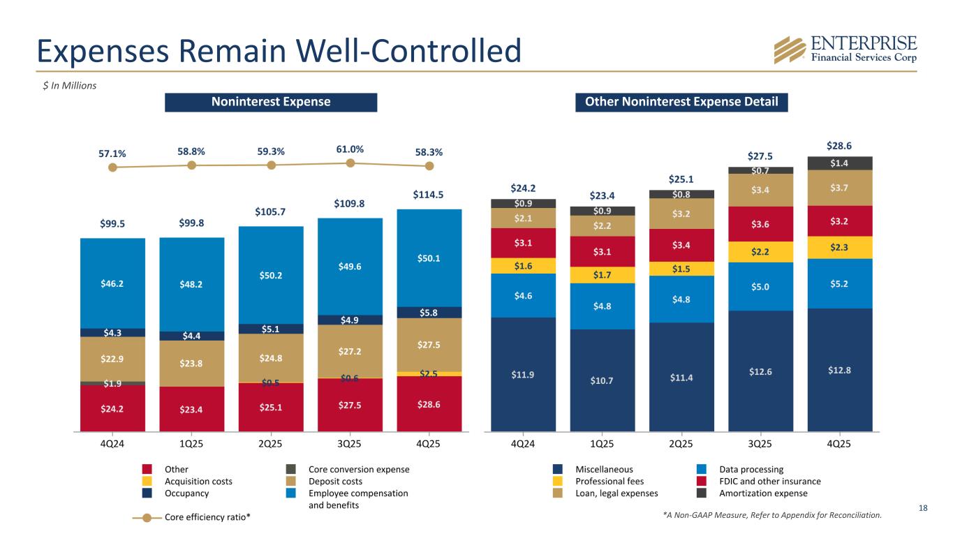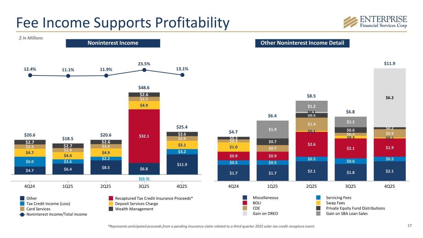 17 Fee Income Supports Profitability Noninterest Income Other Noninterest Income Detail *Represents anticipated proceeds from a pending insurance claim related to a third quarter 2025 solar tax credit recapture event. $ In Millions