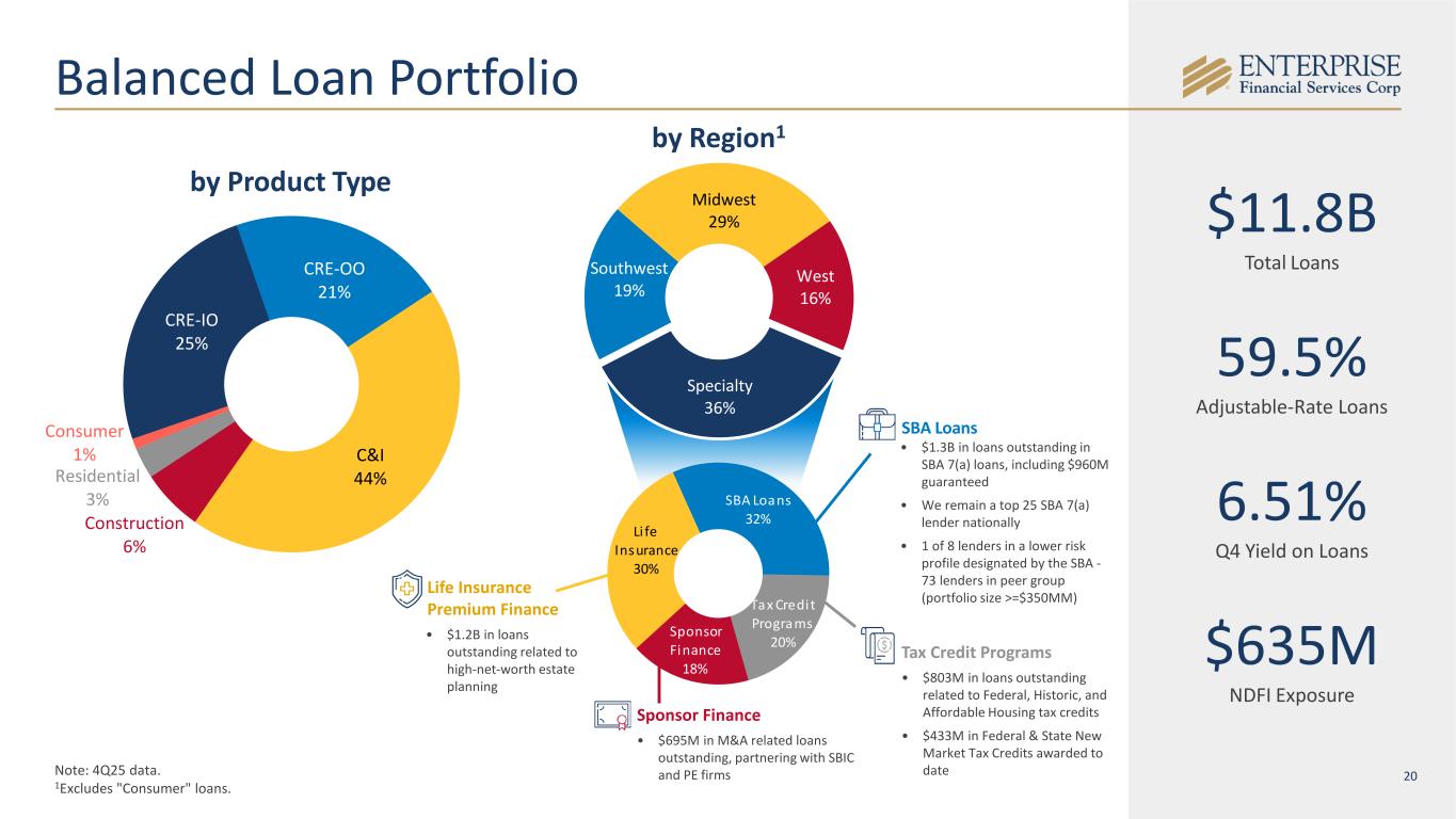19 39% 39% 22% $14.6B Total Deposits Note: 4Q25 data. by Type by Region Interest-Bearing Demand Accounts 24% DDA 33% CD 12% MMA & Savings 31% Diversified Deposit Base 1.64% Q4 Cost of Total Deposits 33.4% Noninterest Bearing Deposits Community Associations $1.5B in deposit accounts. Specifically designed to serve the needs of community associations Property Management $1.5B in deposits. Specializing in the compliance of Property Management Trust Accounts Legal Industry and Escrow Services $833M in deposits. Product lines providing services to independent escrow and non-depository trust companies Midwest 47% West 9% Southwest 18% Deposit Verticals 26%