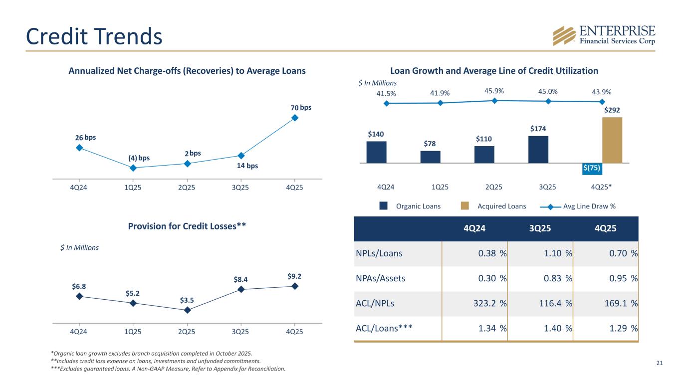 20 Midwest 29% West 16% Specialty 36% Southwest 19% CRE-IO 25% CRE-OO 21% C&I 44% Construction 6% Residential 3% Consumer 1% by Product Type by Region1 Note: 4Q25 data. 1Excludes "Consumer" loans. Balanced Loan Portfolio $11.8B Total Loans 59.5% Adjustable-Rate Loans 6.51% Q4 Yield on Loans $635M NDFI Exposure Tax Credi t Programs 20% Sponsor Finance 18% Li fe Insurance 30% SBA Loans 32% SBA Loans • $1.3B in loans outstanding in SBA 7(a) loans, including $960M guaranteed • We remain a top 25 SBA 7(a) lender nationally • 1 of 8 lenders in a lower risk profile designated by the SBA - 73 lenders in peer group (portfolio size >=$350MM) Life Insurance Premium Finance • $1.2B in loans outstanding related to high-net-worth estate planning Sponsor Finance • $695M in M&A related loans outstanding, partnering with SBIC and PE firms Tax Credit Programs • $803M in loans outstanding related to Federal, Historic, and Affordable Housing tax credits • $433M in Federal & State New Market Tax Credits awarded to date