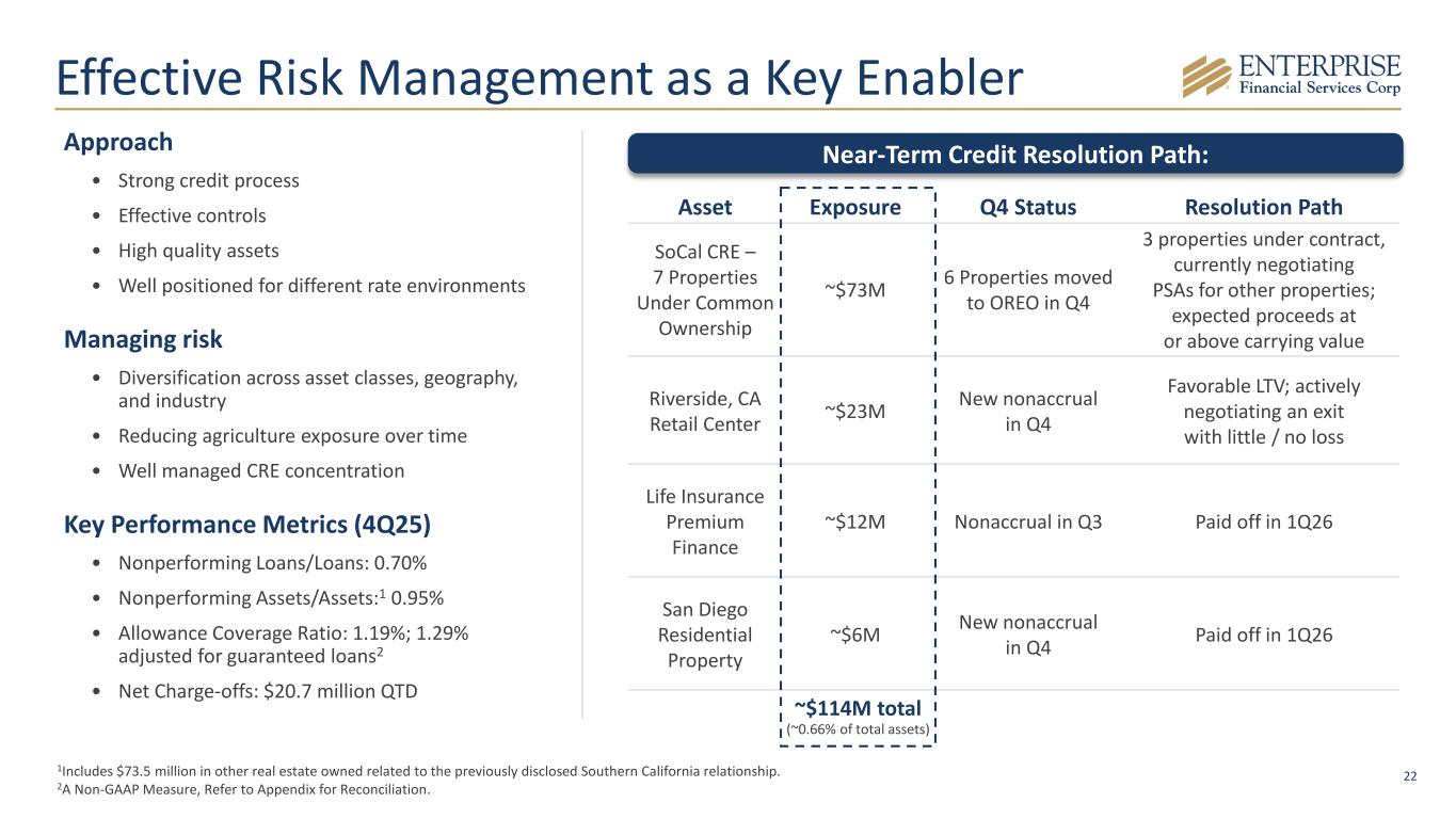 21 Credit Trends 4Q24 3Q25 4Q25 NPLs/Loans 0.38 % 1.10 % 0.70 % NPAs/Assets 0.30 % 0.83 % 0.95 % ACL/NPLs 323.2 % 116.4 % 169.1 % ACL/Loans*** 1.34 % 1.40 % 1.29 % Annualized Net Charge-offs (Recoveries) to Average Loans $ In Millions bps bps bpsbps bps $ In Millions Loan Growth and Average Line of Credit Utilization *Organic loan growth excludes branch acquisition completed in October 2025. **Includes credit loss expense on loans, investments and unfunded commitments. ***Excludes guaranteed loans. A Non-GAAP Measure, Refer to Appendix for Reconciliation.
