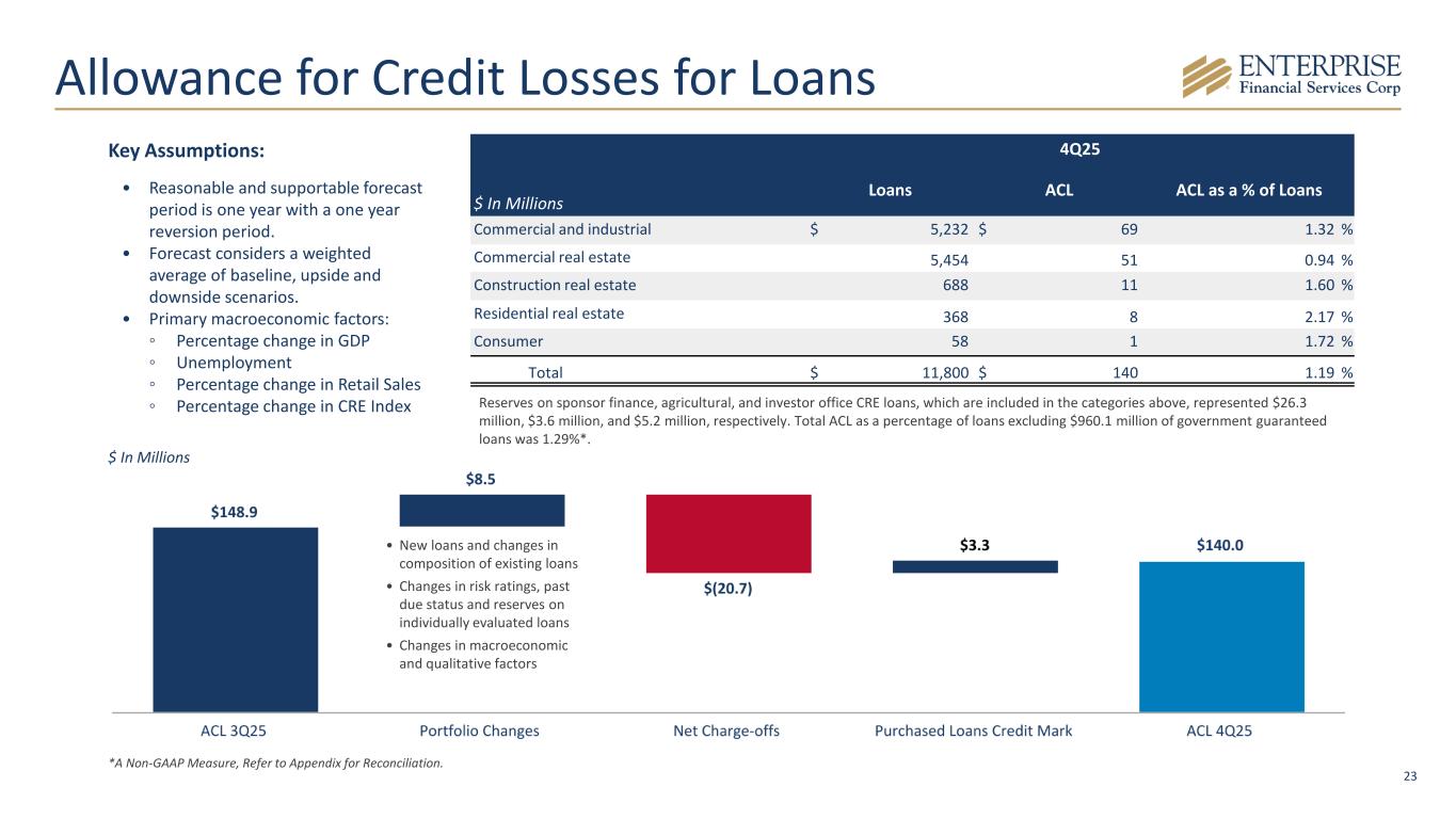 22 Effective Risk Management as a Key Enabler Approach • Strong credit process • Effective controls • High quality assets • Well positioned for different rate environments Managing risk • Diversification across asset classes, geography, and industry • Reducing agriculture exposure over time • Well managed CRE concentration Key Performance Metrics (4Q25) • Nonperforming Loans/Loans: 0.70% • Nonperforming Assets/Assets:1 0.95% • Allowance Coverage Ratio: 1.19%; 1.29% adjusted for guaranteed loans2 • Net Charge-offs: $20.7 million QTD Near-Term Credit Resolution Path: Asset Exposure Q4 Status Resolution Path SoCal CRE – 7 Properties Under Common Ownership ~$73M 6 Properties moved to OREO in Q4 3 properties under contract, currently negotiating PSAs for other properties; expected proceeds at or above carrying value Riverside, CA Retail Center ~$23M New nonaccrual in Q4 Favorable LTV; actively negotiating an exit with little / no loss Life Insurance Premium Finance ~$12M Nonaccrual in Q3 Paid off in 1Q26 San Diego Residential Property ~$6M New nonaccrual in Q4 Paid off in 1Q26 1Includes $73.5 million in other real estate owned related to the previously disclosed Southern California relationship. 2A Non-GAAP Measure, Refer to Appendix for Reconciliation. ~$114M total (~0.66% of total assets)