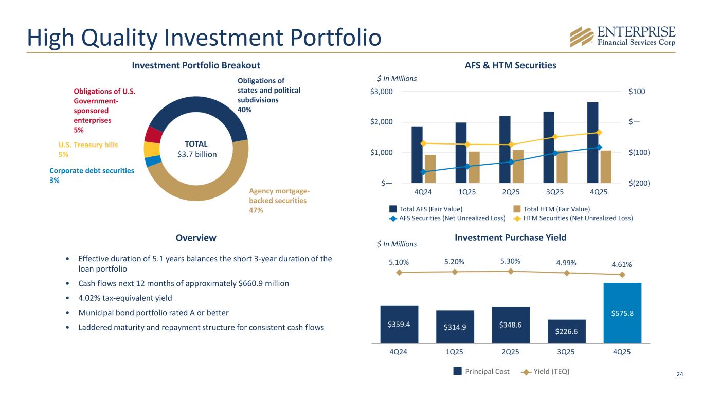 23 Allowance for Credit Losses for Loans $ In Millions • New loans and changes in composition of existing loans • Changes in risk ratings, past due status and reserves on individually evaluated loans • Changes in macroeconomic and qualitative factors $ In Millions 4Q25 Loans ACL ACL as a % of Loans Commercial and industrial $ 5,232 $ 69 1.32 % Commercial real estate 5,454 51 0.94 % Construction real estate 688 11 1.60 % Residential real estate 368 8 2.17 % Consumer 58 1 1.72 % Total $ 11,800 $ 140 1.19 % Reserves on sponsor finance, agricultural, and investor office CRE loans, which are included in the categories above, represented $26.3 million, $3.6 million, and $5.2 million, respectively. Total ACL as a percentage of loans excluding $960.1 million of government guaranteed loans was 1.29%*. Key Assumptions: • Reasonable and supportable forecast period is one year with a one year reversion period. • Forecast considers a weighted average of baseline, upside and downside scenarios. • Primary macroeconomic factors: ◦ Percentage change in GDP ◦ Unemployment ◦ Percentage change in Retail Sales ◦ Percentage change in CRE Index *A Non-GAAP Measure, Refer to Appendix for Reconciliation.