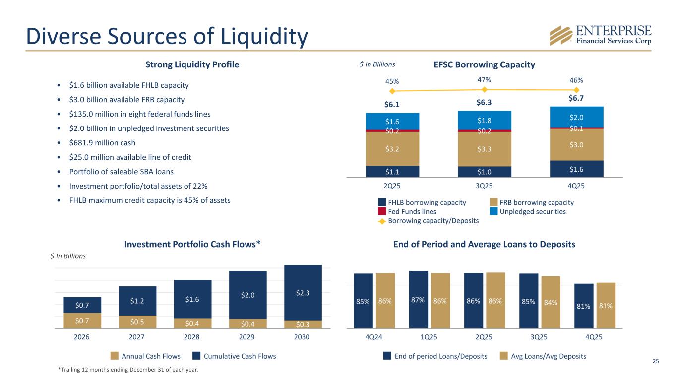 24 High Quality Investment Portfolio Investment Portfolio Breakout AFS & HTM Securities TOTAL $3.7 billion • Effective duration of 5.1 years balances the short 3-year duration of the loan portfolio • Cash flows next 12 months of approximately $660.9 million • 4.02% tax-equivalent yield • Municipal bond portfolio rated A or better • Laddered maturity and repayment structure for consistent cash flows Overview $ In Millions Investment Purchase Yield $ In Millions
