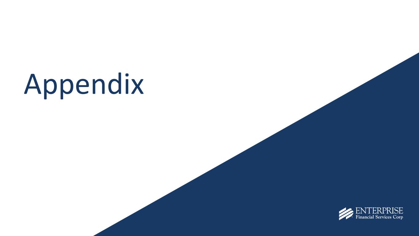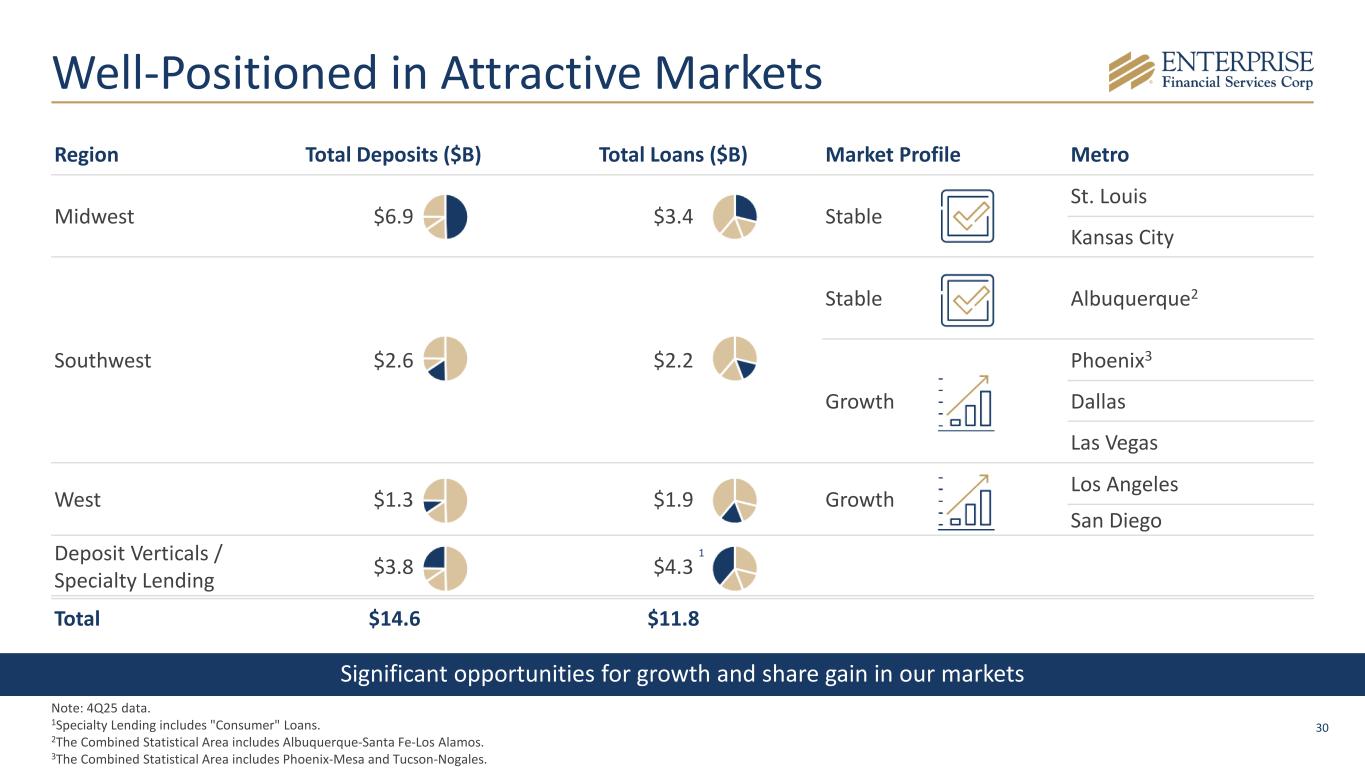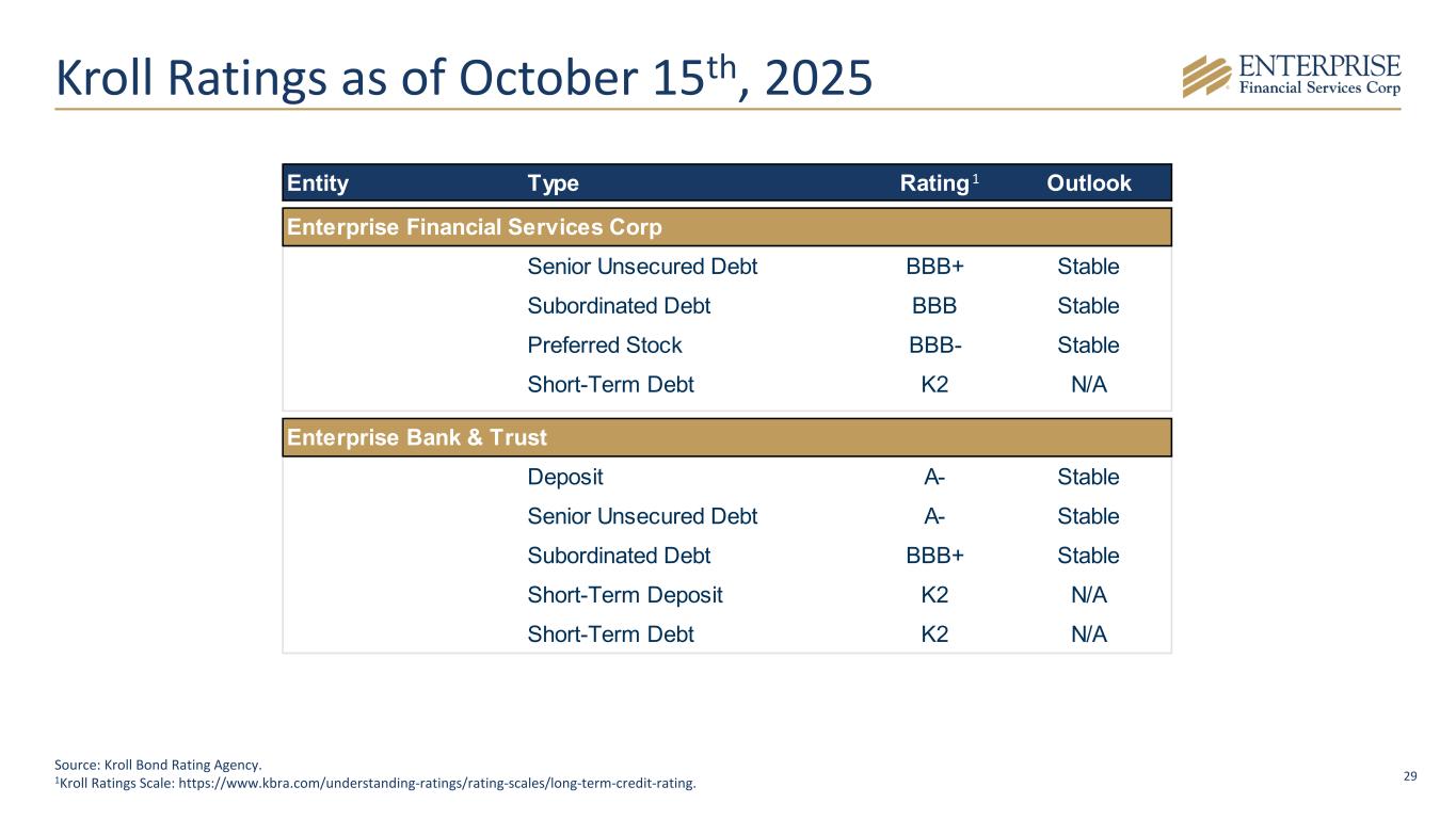 29 Kroll Ratings as of October 15th, 2025 Entity Type Rating Outlook Enterprise Financial Services Corp Senior Unsecured Debt BBB+ Stable Subordinated Debt BBB Stable Preferred Stock BBB- Stable Short-Term Debt K2 N/A Enterprise Bank & Trust Deposit A- Stable Senior Unsecured Debt A- Stable Subordinated Debt BBB+ Stable Short-Term Deposit K2 N/A Short-Term Debt K2 N/A Source: Kroll Bond Rating Agency. 1Kroll Ratings Scale: https://www.kbra.com/understanding-ratings/rating-scales/long-term-credit-rating. 1