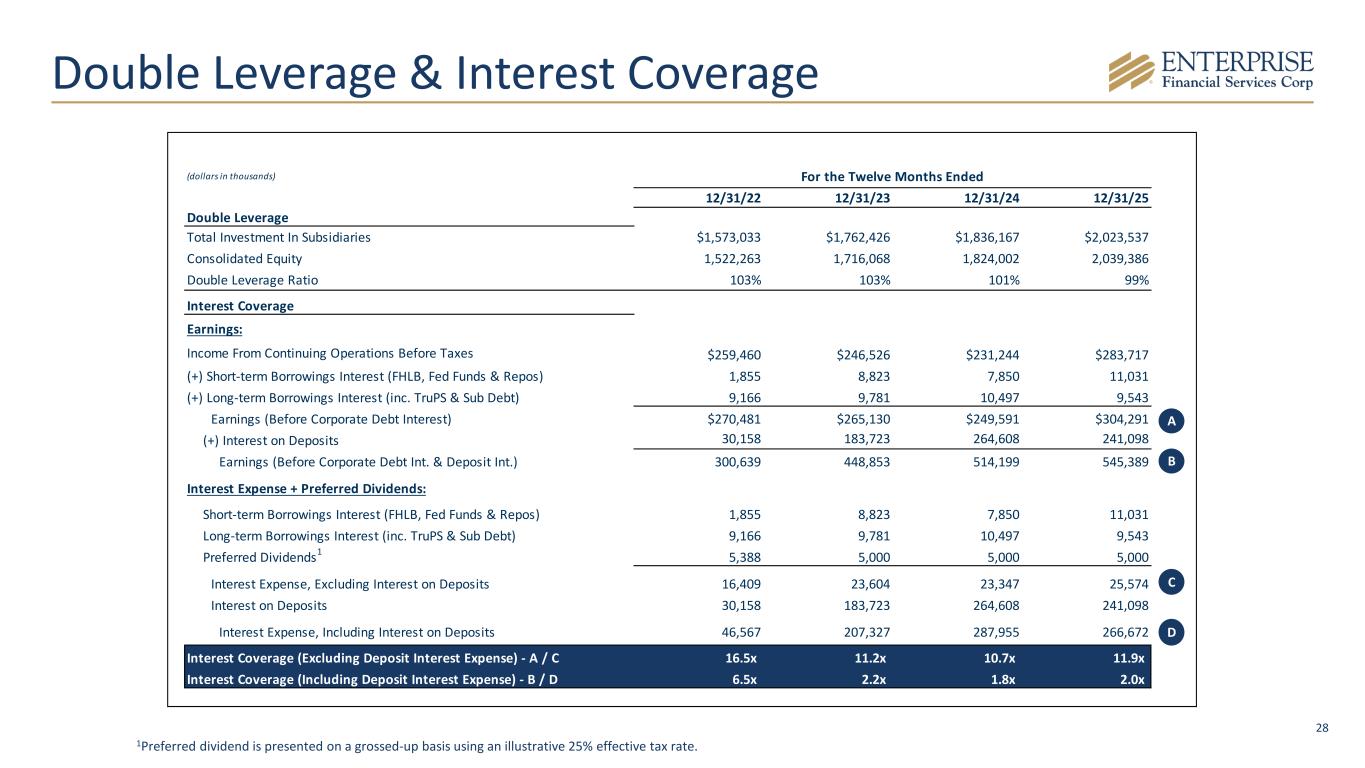 28 Double Leverage & Interest Coverage (dollars in thousands) For the Twelve Months Ended 12/31/22 12/31/23 12/31/24 12/31/25 Double Leverage Total Investment In Subsidiaries $1,573,033 $1,762,426 $1,836,167 $2,023,537 Consolidated Equity 1,522,263 1,716,068 1,824,002 2,039,386 Double Leverage Ratio 103% 103% 101% 99% Interest Coverage Earnings: Income From Continuing Operations Before Taxes $259,460 $246,526 $231,244 $283,717 (+) Short-term Borrowings Interest (FHLB, Fed Funds & Repos) 1,855 8,823 7,850 11,031 (+) Long-term Borrowings Interest (inc. TruPS & Sub Debt) 9,166 9,781 10,497 9,543 Earnings (Before Corporate Debt Interest) $270,481 $265,130 $249,591 $304,291 (+) Interest on Deposits 30,158 183,723 264,608 241,098 Earnings (Before Corporate Debt Int. & Deposit Int.) 300,639 448,853 514,199 545,389 Interest Expense + Preferred Dividends: Short-term Borrowings Interest (FHLB, Fed Funds & Repos) 1,855 8,823 7,850 11,031 Long-term Borrowings Interest (inc. TruPS & Sub Debt) 9,166 9,781 10,497 9,543 Preferred Dividends1 5,388 5,000 5,000 5,000 Interest Expense, Excluding Interest on Deposits 16,409 23,604 23,347 25,574 Interest on Deposits 30,158 183,723 264,608 241,098 Interest Expense, Including Interest on Deposits 46,567 207,327 287,955 266,672 Interest Coverage (Excluding Deposit Interest Expense) - A / C 16.5x 11.2x 10.7x 11.9x Interest Coverage (Including Deposit Interest Expense) - B / D 6.5x 2.2x 1.8x 2.0x A B C D 1Preferred dividend is presented on a grossed-up basis using an illustrative 25% effective tax rate.