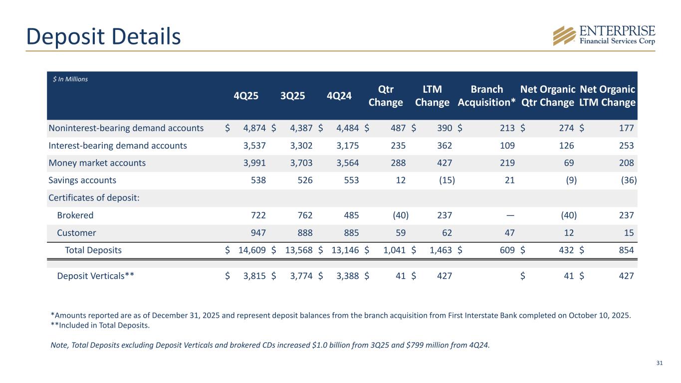 30 Significant opportunities for growth and share gain in our markets Region Total Deposits ($B) Total Loans ($B) Market Profile Metro Midwest $6.9 $3.4 Stable St. Louis Kansas City Southwest $2.6 $2.2 Stable Albuquerque2 Growth Phoenix3 Dallas Las Vegas West $1.3 $1.9 Growth Los Angeles San Diego Deposit Verticals / Specialty Lending $3.8 $4.3 Total $14.6 $11.8 Note: 4Q25 data. 1Specialty Lending includes "Consumer" Loans. 2The Combined Statistical Area includes Albuquerque-Santa Fe-Los Alamos. 3The Combined Statistical Area includes Phoenix-Mesa and Tucson-Nogales. 1 Well-Positioned in Attractive Markets