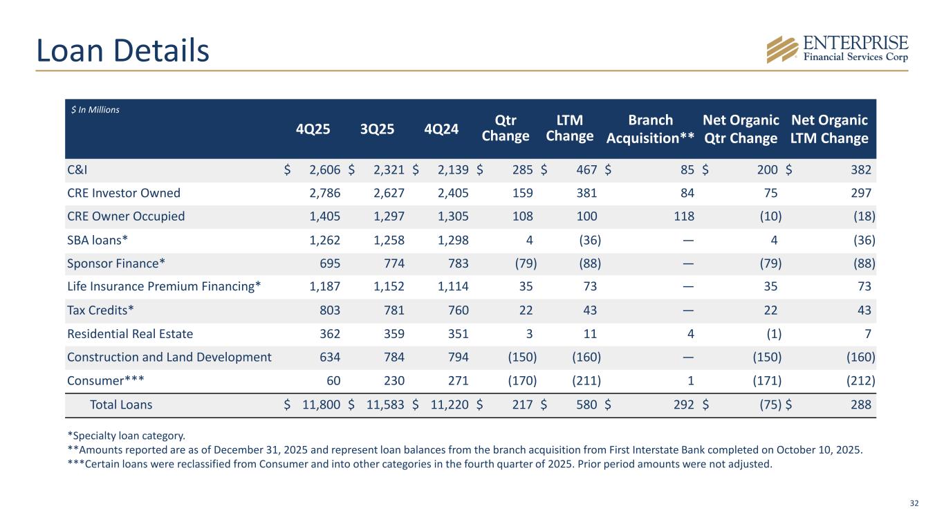 31 Deposit Details 4Q25 3Q25 4Q24 Qtr Change LTM Change Branch Acquisition* Net Organic Qtr Change Net Organic LTM Change Noninterest-bearing demand accounts $ 4,874 $ 4,387 $ 4,484 $ 487 $ 390 $ 213 $ 274 $ 177 Interest-bearing demand accounts 3,537 3,302 3,175 235 362 109 126 253 Money market accounts 3,991 3,703 3,564 288 427 219 69 208 Savings accounts 538 526 553 12 (15) 21 (9) (36) Certificates of deposit: Brokered 722 762 485 (40) 237 — (40) 237 Customer 947 888 885 59 62 47 12 15 Total Deposits $ 14,609 $ 13,568 $ 13,146 $ 1,041 $ 1,463 $ 609 $ 432 $ 854 Deposit Verticals** $ 3,815 $ 3,774 $ 3,388 $ 41 $ 427 $ 41 $ 427 $ In Millions *Amounts reported are as of December 31, 2025 and represent deposit balances from the branch acquisition from First Interstate Bank completed on October 10, 2025. **Included in Total Deposits. Note, Total Deposits excluding Deposit Verticals and brokered CDs increased $1.0 billion from 3Q25 and $799 million from 4Q24.