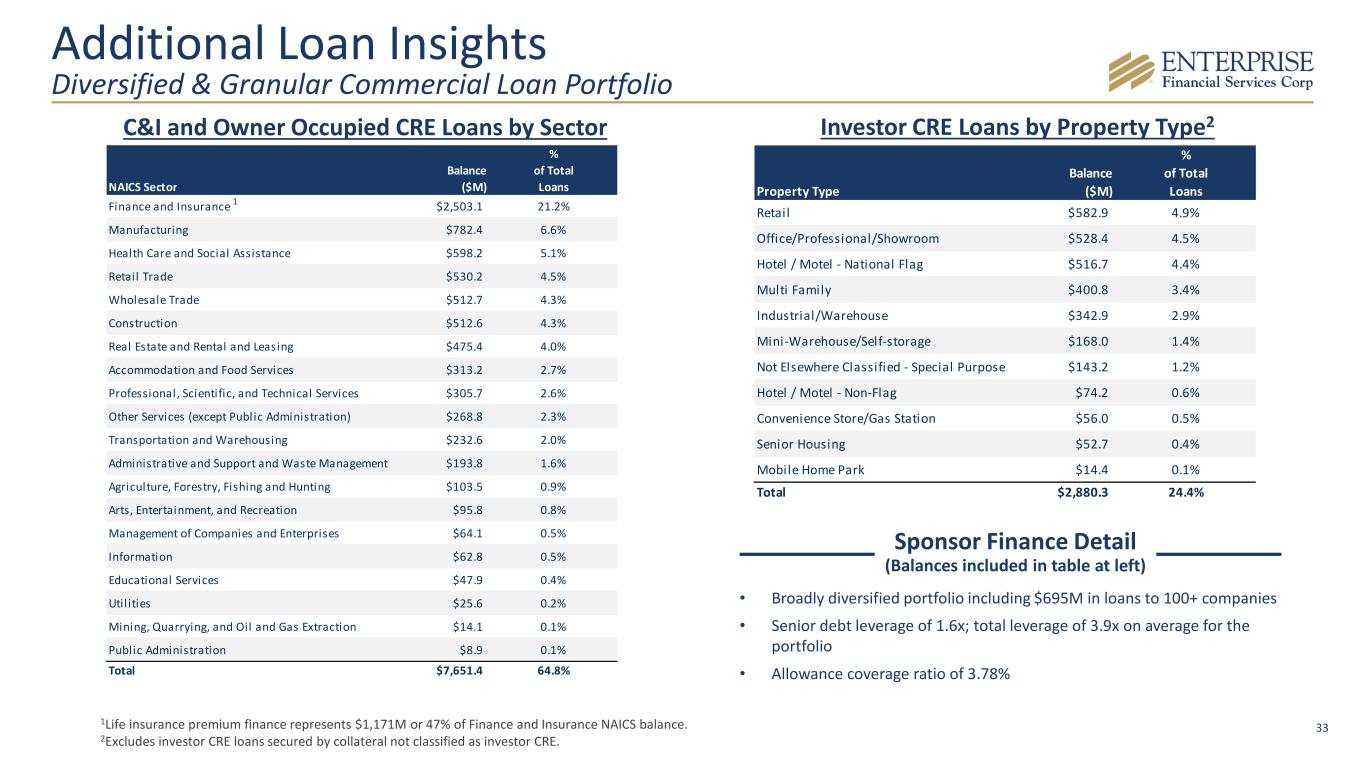 32 Loan Details 4Q25 3Q25 4Q24 Qtr Change LTM Change Branch Acquisition** Net Organic Qtr Change Net Organic LTM Change C&I $ 2,606 $ 2,321 $ 2,139 $ 285 $ 467 $ 85 $ 200 $ 382 CRE Investor Owned 2,786 2,627 2,405 159 381 84 75 297 CRE Owner Occupied 1,405 1,297 1,305 108 100 118 (10) (18) SBA loans* 1,262 1,258 1,298 4 (36) — 4 (36) Sponsor Finance* 695 774 783 (79) (88) — (79) (88) Life Insurance Premium Financing* 1,187 1,152 1,114 35 73 — 35 73 Tax Credits* 803 781 760 22 43 — 22 43 Residential Real Estate 362 359 351 3 11 4 (1) 7 Construction and Land Development 634 784 794 (150) (160) — (150) (160) Consumer*** 60 230 271 (170) (211) 1 (171) (212) Total Loans $ 11,800 $ 11,583 $ 11,220 $ 217 $ 580 $ 292 $ (75) $ 288 *Specialty loan category. **Amounts reported are as of December 31, 2025 and represent loan balances from the branch acquisition from First Interstate Bank completed on October 10, 2025. ***Certain loans were reclassified from Consumer and into other categories in the fourth quarter of 2025. Prior period amounts were not adjusted. $ In Millions