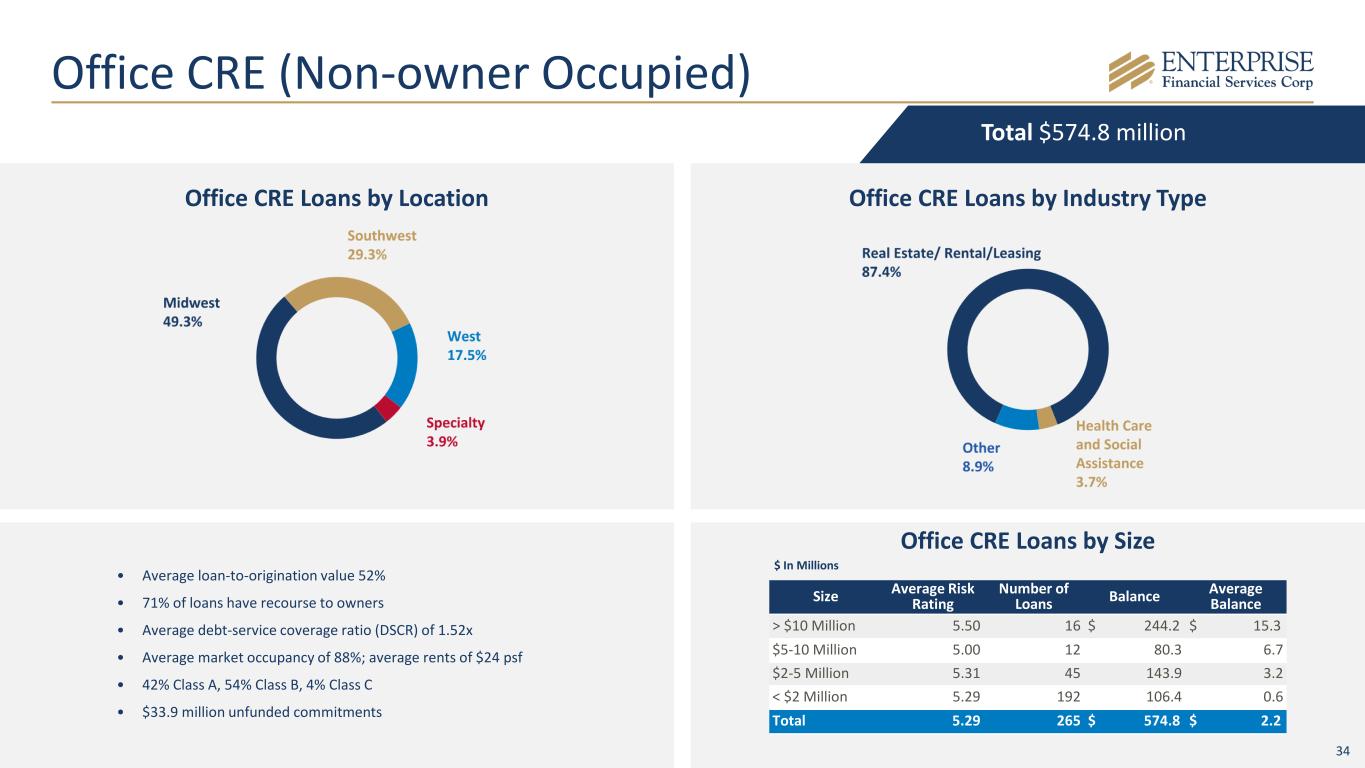 33 • Broadly diversified portfolio including $695M in loans to 100+ companies • Senior debt leverage of 1.6x; total leverage of 3.9x on average for the portfolio • Allowance coverage ratio of 3.78% Additional Loan Insights Diversified & Granular Commercial Loan Portfolio % Balance of Total NAICS Sector ($M) Loans Finance and Insurance $2,503.1 21.2% Manufacturing $782.4 6.6% Health Care and Social Assistance $598.2 5.1% Retail Trade $530.2 4.5% Wholesale Trade $512.7 4.3% Construction $512.6 4.3% Real Estate and Rental and Leasing $475.4 4.0% Accommodation and Food Services $313.2 2.7% Professional, Scientific, and Technical Services $305.7 2.6% Other Services (except Public Administration) $268.8 2.3% Transportation and Warehousing $232.6 2.0% Administrative and Support and Waste Management $193.8 1.6% Agriculture, Forestry, Fishing and Hunting $103.5 0.9% Arts, Entertainment, and Recreation $95.8 0.8% Management of Companies and Enterprises $64.1 0.5% Information $62.8 0.5% Educational Services $47.9 0.4% Util ities $25.6 0.2% Mining, Quarrying, and Oil and Gas Extraction $14.1 0.1% Public Administration $8.9 0.1% Total $7,651.4 64.8% 1 C&I and Owner Occupied CRE Loans by Sector 1Life insurance premium finance represents $1,171M or 47% of Finance and Insurance NAICS balance. 2Excludes investor CRE loans secured by collateral not classified as investor CRE. Investor CRE Loans by Property Type2 % Balance of Total Property Type ($M) Loans Retail $582.9 4.9% Office/Professional/Showroom $528.4 4.5% Hotel / Motel - National Flag $516.7 4.4% Multi Family $400.8 3.4% Industrial/Warehouse $342.9 2.9% Mini-Warehouse/Self-storage $168.0 1.4% Not Elsewhere Classified - Special Purpose $143.2 1.2% Hotel / Motel - Non-Flag $74.2 0.6% Convenience Store/Gas Station $56.0 0.5% Senior Housing $52.7 0.4% Mobile Home Park $14.4 0.1% Total $2,880.3 24.4% Sponsor Finance Detail (Balances included in table at left)