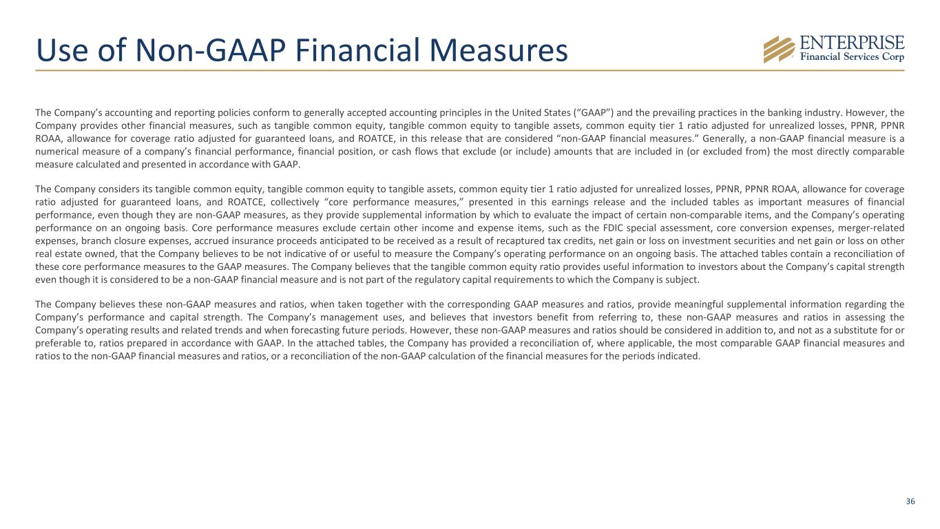 36 The Company’s accounting and reporting policies conform to generally accepted accounting principles in the United States (“GAAP”) and the prevailing practices in the banking industry. However, the Company provides other financial measures, such as tangible common equity, tangible common equity to tangible assets, common equity tier 1 ratio adjusted for unrealized losses, PPNR, PPNR ROAA, allowance for coverage ratio adjusted for guaranteed loans, and ROATCE, in this release that are considered “non-GAAP financial measures.” Generally, a non-GAAP financial measure is a numerical measure of a company’s financial performance, financial position, or cash flows that exclude (or include) amounts that are included in (or excluded from) the most directly comparable measure calculated and presented in accordance with GAAP. The Company considers its tangible common equity, tangible common equity to tangible assets, common equity tier 1 ratio adjusted for unrealized losses, PPNR, PPNR ROAA, allowance for coverage ratio adjusted for guaranteed loans, and ROATCE, collectively “core performance measures,” presented in this earnings release and the included tables as important measures of financial performance, even though they are non-GAAP measures, as they provide supplemental information by which to evaluate the impact of certain non-comparable items, and the Company’s operating performance on an ongoing basis. Core performance measures exclude certain other income and expense items, such as the FDIC special assessment, core conversion expenses, merger-related expenses, branch closure expenses, accrued insurance proceeds anticipated to be received as a result of recaptured tax credits, net gain or loss on investment securities and net gain or loss on other real estate owned, that the Company believes to be not indicative of or useful to measure the Company’s operating performance on an ongoing basis. The attached tables contain a reconciliation of these core performance measures to the GAAP measures. The Company believes that the tangible common equity ratio provides useful information to investors about the Company’s capital strength even though it is considered to be a non-GAAP financial measure and is not part of the regulatory capital requirements to which the Company is subject. The Company believes these non-GAAP measures and ratios, when taken together with the corresponding GAAP measures and ratios, provide meaningful supplemental information regarding the Company’s performance and capital strength. The Company’s management uses, and believes that investors benefit from referring to, these non-GAAP measures and ratios in assessing the Company’s operating results and related trends and when forecasting future periods. However, these non-GAAP measures and ratios should be considered in addition to, and not as a substitute for or preferable to, ratios prepared in accordance with GAAP. In the attached tables, the Company has provided a reconciliation of, where applicable, the most comparable GAAP financial measures and ratios to the non-GAAP financial measures and ratios, or a reconciliation of the non-GAAP calculation of the financial measures for the periods indicated. Use of Non-GAAP Financial Measures