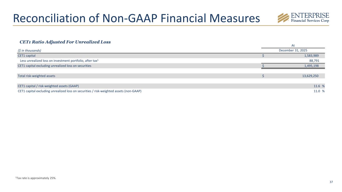 37 At ($ in thousands) December 31, 2025 CET1 capital $ 1,583,989 Less unrealized loss on investment portfolio, after tax1 88,791 CET1 capital excluding unrealized loss on securities $ 1,495,198 Total risk-weighted assets $ 13,629,250 CET1 capital / risk-weighted assets (GAAP) 11.6 % CET1 capital excluding unrealized loss on securities / risk-weighted assets (non-GAAP) 11.0 % CET1 Ratio Adjusted For Unrealized Loss Reconciliation of Non-GAAP Financial Measures 1Tax rate is approximately 25%.