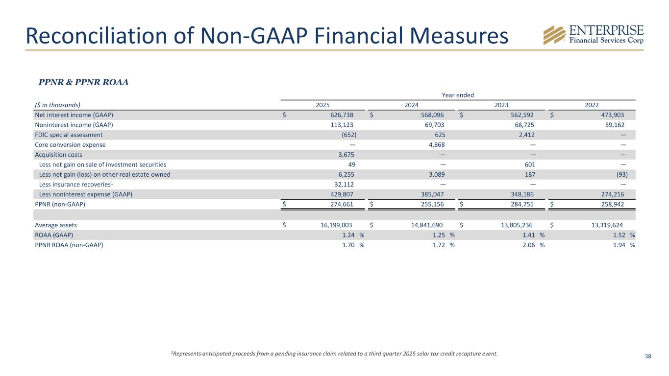38 Year ended ($ in thousands) 2025 2024 2023 2022 Net interest income (GAAP) $ 626,738 $ 568,096 $ 562,592 $ 473,903 Noninterest income (GAAP) 113,123 69,703 68,725 59,162 FDIC special assessment (652) 625 2,412 — Core conversion expense — 4,868 — — Acquisition costs 3,675 — — — Less net gain on sale of investment securities 49 — 601 — Less net gain (loss) on other real estate owned 6,255 3,089 187 (93) Less insurance recoveries1 32,112 — — — Less noninterest expense (GAAP) 429,807 385,047 348,186 274,216 PPNR (non-GAAP) $ 274,661 $ 255,156 $ 284,755 $ 258,942 Average assets $ 16,199,003 $ 14,841,690 $ 13,805,236 $ 13,319,624 ROAA (GAAP) 1.24 % 1.25 % 1.41 % 1.52 % PPNR ROAA (non-GAAP) 1.70 % 1.72 % 2.06 % 1.94 % PPNR & PPNR ROAA Reconciliation of Non-GAAP Financial Measures 1Represents anticipated proceeds from a pending insurance claim related to a third quarter 2025 solar tax credit recapture event.