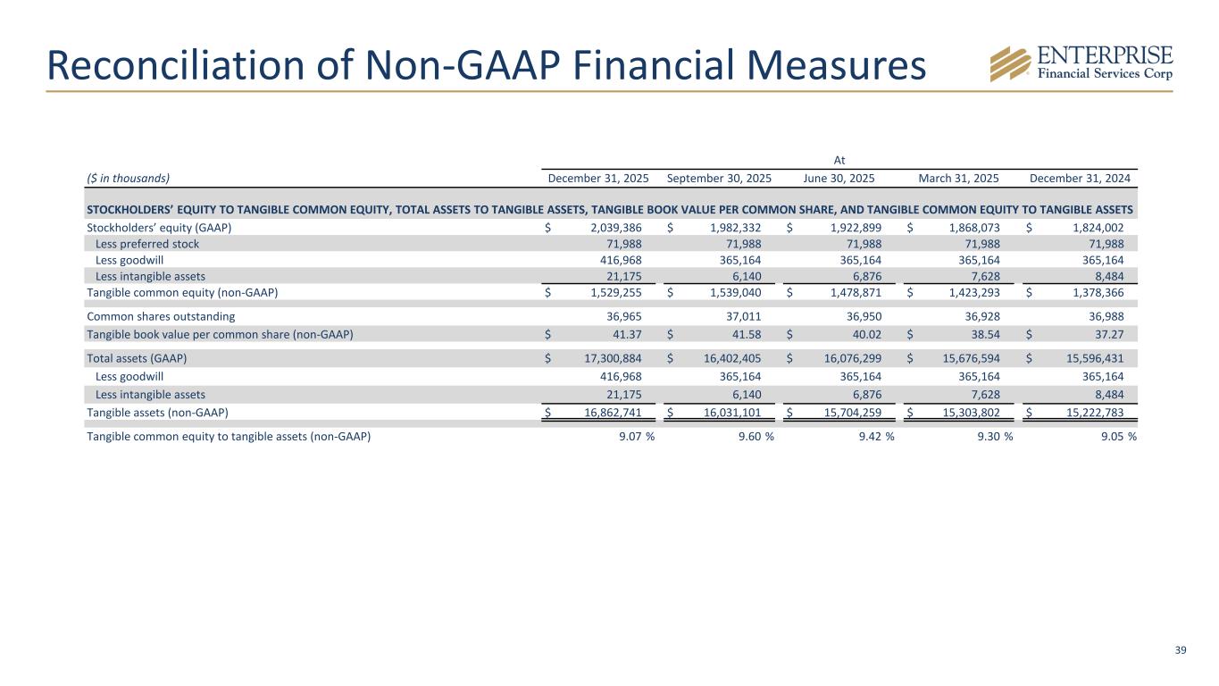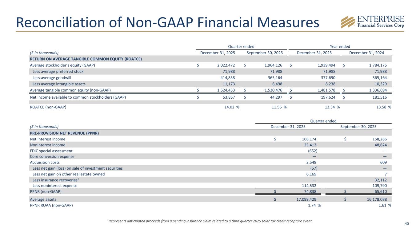 39 Reconciliation of Non-GAAP Financial Measures At ($ in thousands) December 31, 2025 September 30, 2025 June 30, 2025 March 31, 2025 December 31, 2024 STOCKHOLDERS’ EQUITY TO TANGIBLE COMMON EQUITY, TOTAL ASSETS TO TANGIBLE ASSETS, TANGIBLE BOOK VALUE PER COMMON SHARE, AND TANGIBLE COMMON EQUITY TO TANGIBLE ASSETS Stockholders’ equity (GAAP) $ 2,039,386 $ 1,982,332 $ 1,922,899 $ 1,868,073 $ 1,824,002 Less preferred stock 71,988 71,988 71,988 71,988 71,988 Less goodwill 416,968 365,164 365,164 365,164 365,164 Less intangible assets 21,175 6,140 6,876 7,628 8,484 Tangible common equity (non-GAAP) $ 1,529,255 $ 1,539,040 $ 1,478,871 $ 1,423,293 $ 1,378,366 Common shares outstanding 36,965 37,011 36,950 36,928 36,988 Tangible book value per common share (non-GAAP) $ 41.37 $ 41.58 $ 40.02 $ 38.54 $ 37.27 Total assets (GAAP) $ 17,300,884 $ 16,402,405 $ 16,076,299 $ 15,676,594 $ 15,596,431 Less goodwill 416,968 365,164 365,164 365,164 365,164 Less intangible assets 21,175 6,140 6,876 7,628 8,484 Tangible assets (non-GAAP) $ 16,862,741 $ 16,031,101 $ 15,704,259 $ 15,303,802 $ 15,222,783 Tangible common equity to tangible assets (non-GAAP) 9.07 % 9.60 % 9.42 % 9.30 % 9.05 %