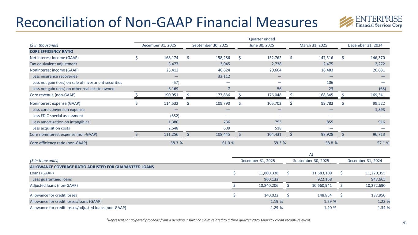 41 Reconciliation of Non-GAAP Financial Measures 1Represents anticipated proceeds from a pending insurance claim related to a third quarter 2025 solar tax credit recapture event. At ($ in thousands) December 31, 2025 September 30, 2025 December 31, 2024 ALLOWANCE COVERAGE RATIO ADJUSTED FOR GUARANTEED LOANS Loans (GAAP) $ 11,800,338 $ 11,583,109 $ 11,220,355 Less guaranteed loans 960,132 922,168 947,665 Adjusted loans (non-GAAP) $ 10,840,206 $ 10,660,941 $ 10,272,690 Allowance for credit losses $ 140,022 $ 148,854 $ 137,950 Allowance for credit losses/loans (GAAP) 1.19 % 1.29 % 1.23 % Allowance for credit losses/adjusted loans (non-GAAP) 1.29 % 1.40 % 1.34 % Quarter ended ($ in thousands) December 31, 2025 September 30, 2025 June 30, 2025 March 31, 2025 December 31, 2024 CORE EFFICIENCY RATIO Net interest income (GAAP) $ 168,174 $ 158,286 $ 152,762 $ 147,516 $ 146,370 Tax-equivalent adjustment 3,477 3,045 2,738 2,475 2,272 Noninterest income (GAAP) 25,412 48,624 20,604 18,483 20,631 Less insurance recoveries1 — 32,112 — — — Less net gain (loss) on sale of investment securities (57) — — 106 — Less net gain (loss) on other real estate owned 6,169 7 56 23 (68) Core revenue (non-GAAP) $ 190,951 $ 177,836 $ 176,048 $ 168,345 $ 169,341 Noninterest expense (GAAP) $ 114,532 $ 109,790 $ 105,702 $ 99,783 $ 99,522 Less core conversion expense — — — — 1,893 Less FDIC special assessment (652) — — — — Less amortization on intangibles 1,380 736 753 855 916 Less acquisition costs 2,548 609 518 — — Core noninterest expense (non-GAAP) $ 111,256 $ 108,445 $ 104,431 $ 98,928 $ 96,713 Core efficiency ratio (non-GAAP) 58.3 % 61.0 % 59.3 % 58.8 % 57.1 %