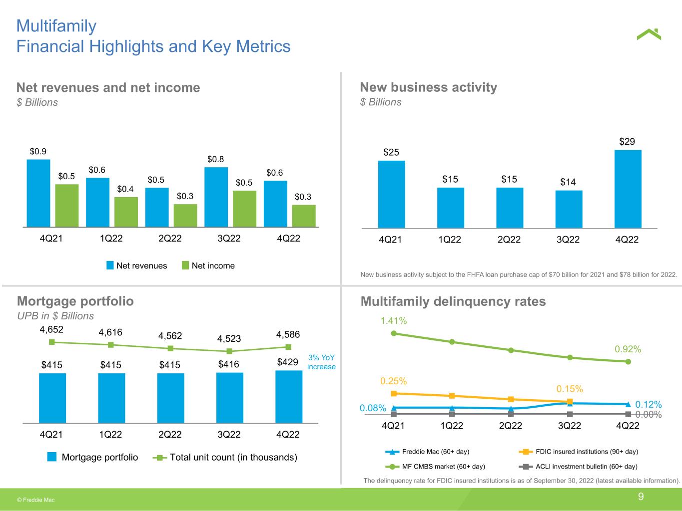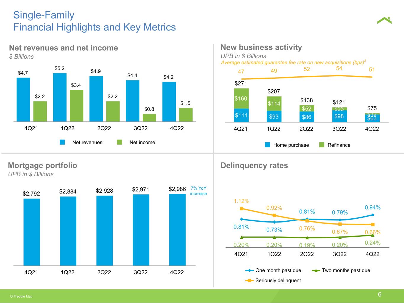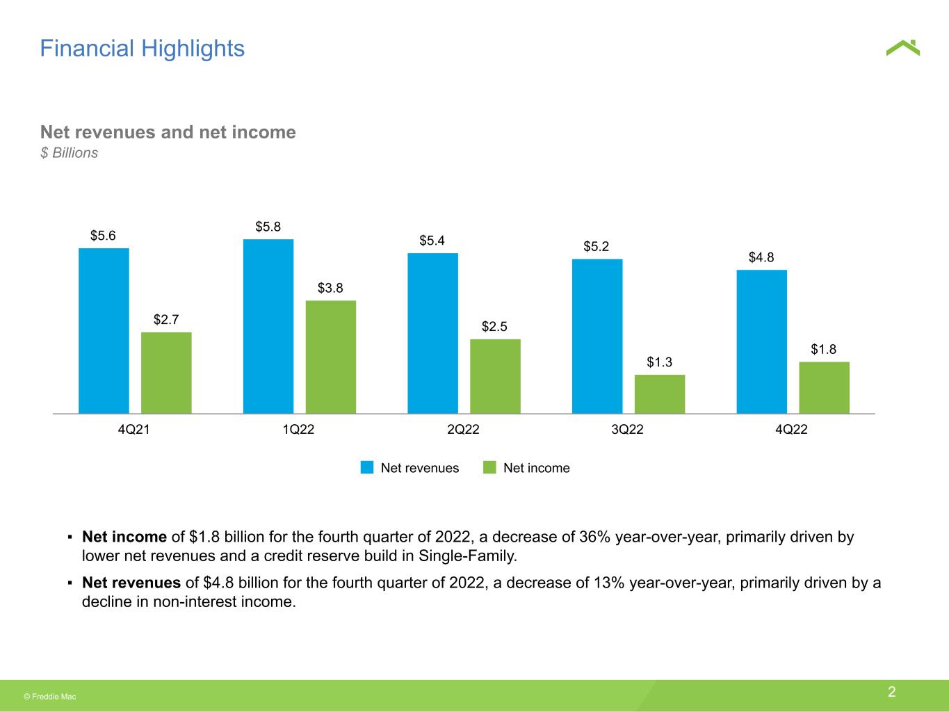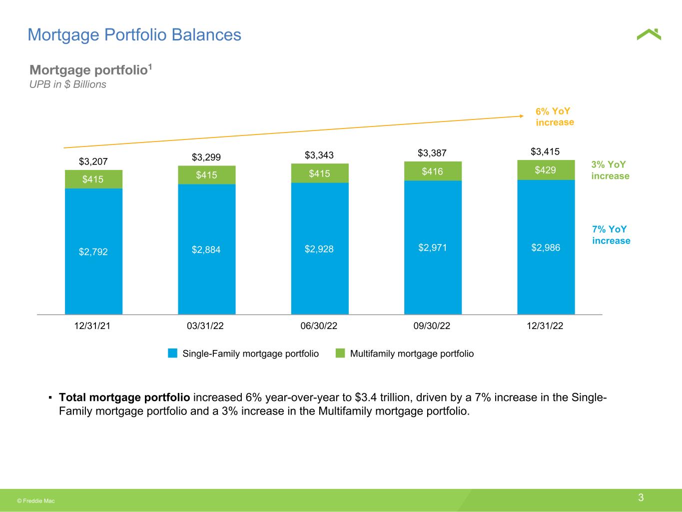 © Freddie Mac 2 Financial Highlights $5.6 $5.8 $5.4 $5.2 $4.8 $2.7 $3.8 $2.5 $1.3 $1.8 Net revenues Net income 4Q21 1Q22 2Q22 3Q22 4Q22 Net revenues and net income $ Billions ▪ Net income of $1.8 billion for the fourth quarter of 2022, a decrease of 36% year-over-year, primarily driven by lower net revenues and a credit reserve build in Single-Family. ▪ Net revenues of $4.8 billion for the fourth quarter of 2022, a decrease of 13% year-over-year, primarily driven by a decline in non-interest income.