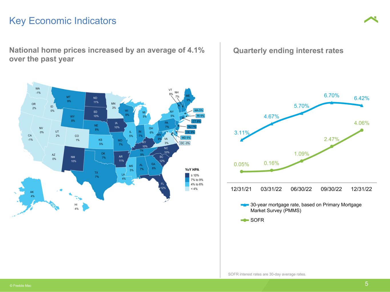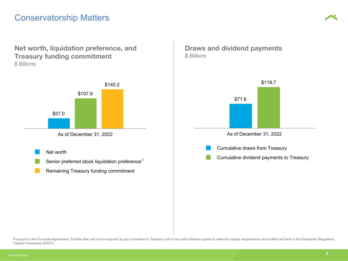 © Freddie Mac 4 $37.0 $107.9 $140.2 Net worth Senior preferred stock liquidation preference Remaining Treasury funding commitment As of December 31, 2022 Conservatorship Matters Pursuant to the Purchase Agreement, Freddie Mac will not be required to pay a dividend to Treasury until it has built sufficient capital to meet the capital requirements and buffers set forth in the Enterprise Regulatory Capital Framework (ERCF). Draws and dividend payments $ Billions Net worth, liquidation preference, and Treasury funding commitment $ Billions $71.6 $119.7 Cumulative draws from Treasury Cumulative dividend payments to Treasury As of December 31, 2022 2
