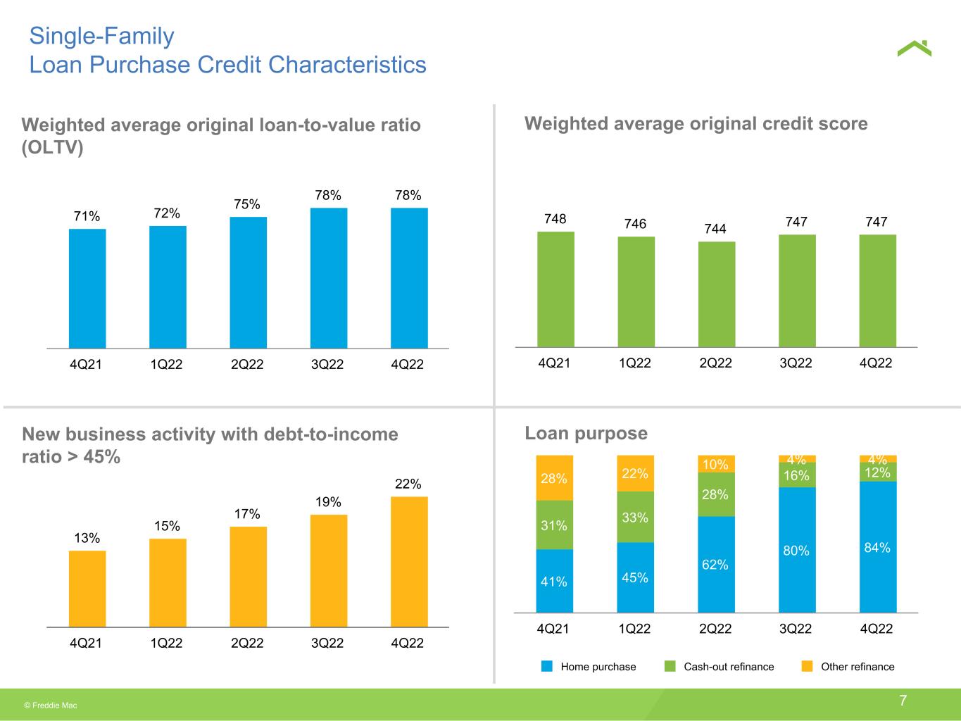 © Freddie Mac 6 $2,792 $2,884 $2,928 $2,971 $2,986 4Q21 1Q22 2Q22 3Q22 4Q22 0.81% 0.73% 0.81% 0.79% 0.94% 0.20% 0.20% 0.19% 0.20% 0.24% 1.12% 0.92% 0.76% 0.67% 0.66% One month past due Two months past due Seriously delinquent 4Q21 1Q22 2Q22 3Q22 4Q22 $271 $207 $138 $121 $75 $111 $93 $86 $98 $63 $160 $114 $52 $23 $12 47 49 52 54 51 Home purchase Refinance 4Q21 1Q22 2Q22 3Q22 4Q22 Single-Family Financial Highlights and Key Metrics $4.7 $5.2 $4.9 $4.4 $4.2 $2.2 $3.4 $2.2 $0.8 $1.5 Net revenues Net income 4Q21 1Q22 2Q22 3Q22 4Q22 Net revenues and net income $ Billions 7% YoY increase Mortgage portfolio UPB in $ Billions Average estimated guarantee fee rate on new acquisitions (bps)3 Delinquency rates New business activity UPB in $ Billions