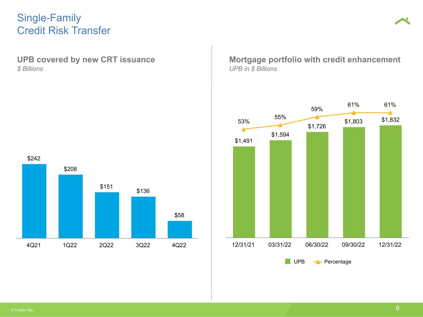 © Freddie Mac 7 71% 72% 75% 78% 78% 4Q21 1Q22 2Q22 3Q22 4Q22 41% 45% 62% 80% 84% 31% 33% 28% 16% 12%28% 22% 10% 4% 4% Home purchase Cash-out refinance Other refinance 4Q21 1Q22 2Q22 3Q22 4Q22 748 746 744 747 747 4Q21 1Q22 2Q22 3Q22 4Q22 13% 15% 17% 19% 22% 4Q21 1Q22 2Q22 3Q22 4Q22 New business activity with debt-to-income ratio > 45% Weighted average original loan-to-value ratio (OLTV) Weighted average original credit score Single-Family Loan Purchase Credit Characteristics Loan purpose