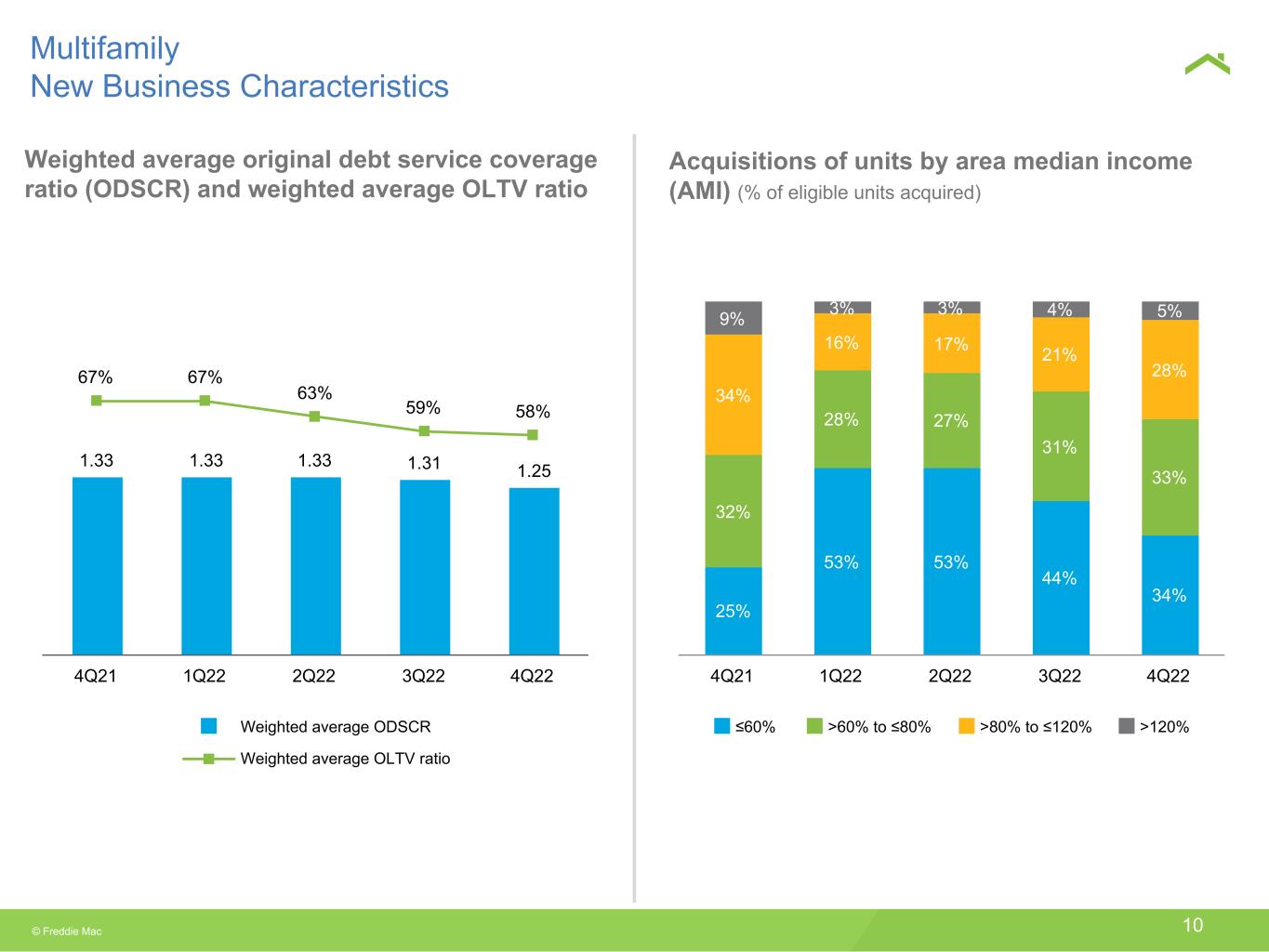 © Freddie Mac 9 $25 $15 $15 $14 $29 4Q21 1Q22 2Q22 3Q22 4Q22 0.08% 0.12% 0.25% 0.15% 1.41% 0.92% 0.00% Freddie Mac (60+ day) FDIC insured institutions (90+ day) MF CMBS market (60+ day) ACLI investment bulletin (60+ day) 4Q21 1Q22 2Q22 3Q22 4Q22 Multifamily delinquency rates $415 $415 $415 $416 $429 4,652 4,616 4,562 4,523 4,586 Mortgage portfolio Total unit count (in thousands) 4Q21 1Q22 2Q22 3Q22 4Q22 Multifamily Financial Highlights and Key Metrics Net revenues and net income $ Billions $0.9 $0.6 $0.5 $0.8 $0.6$0.5 $0.4 $0.3 $0.5 $0.3 Net revenues Net income 4Q21 1Q22 2Q22 3Q22 4Q22 (89 %) New business activity $ Billions Mortgage portfolio UPB in $ Billions 3% YoY increase The delinquency rate for FDIC insured institutions is as of September 30, 2022 (latest available information). New business activity subject to the FHFA loan purchase cap of $70 billion for 2021 and $78 billion for 2022.