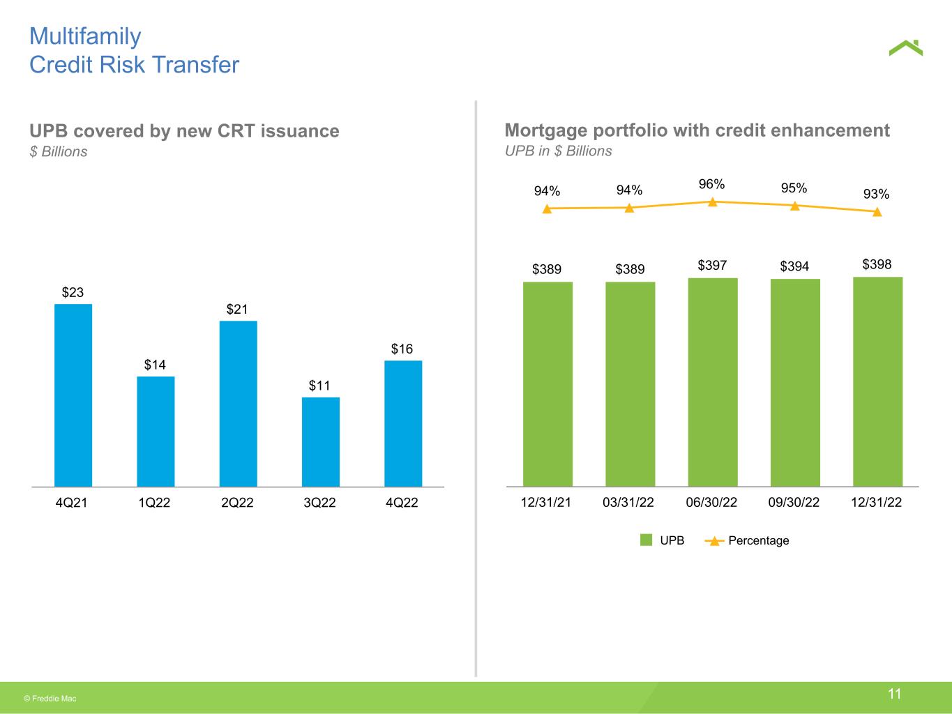 © Freddie Mac 11 $389 $389 $397 $394 $398 94% 94% 96% 95% 93% UPB Percentage 12/31/21 03/31/22 06/30/22 09/30/22 12/31/22 Mortgage portfolio with credit enhancement UPB in $ Billions $23 $14 $21 $11 $16 4Q21 1Q22 2Q22 3Q22 4Q22 Multifamily Credit Risk Transfer UPB covered by new CRT issuance $ Billions