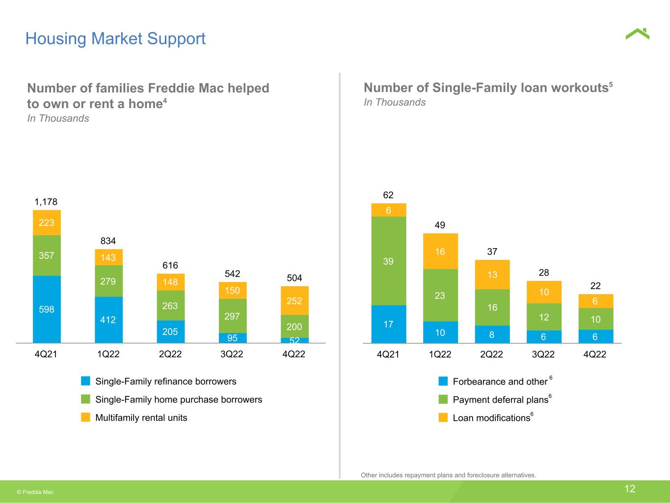 © Freddie Mac 12 62 49 37 28 22 17 10 8 6 6 39 23 16 12 10 6 16 13 10 6 Forbearance and other Payment deferral plans Loan modifications 4Q21 1Q22 2Q22 3Q22 4Q22 Number of families Freddie Mac helped to own or rent a home4 In Thousands Housing Market Support 1,178 834 616 542 504 598 412 205 95 52 357 279 263 297 200 223 143 148 150 252 Single-Family refinance borrowers Single-Family home purchase borrowers Multifamily rental units 4Q21 1Q22 2Q22 3Q22 4Q22 Other includes repayment plans and foreclosure alternatives. 6 Number of Single-Family loan workouts5 In Thousands 6 6