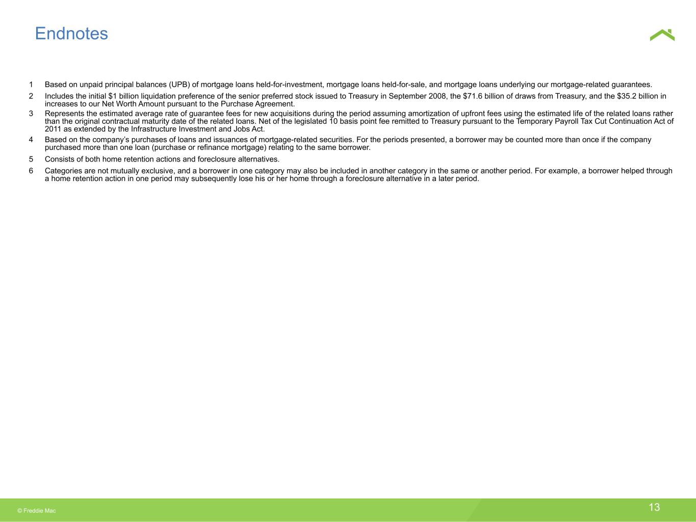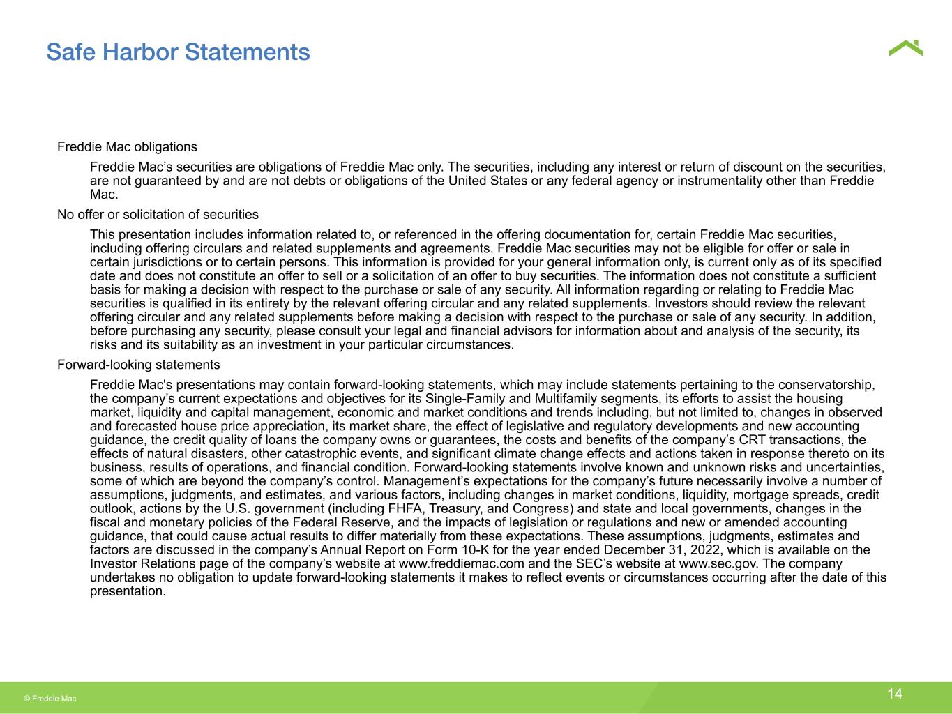 © Freddie Mac 13 Endnotes 1 Based on unpaid principal balances (UPB) of mortgage loans held-for-investment, mortgage loans held-for-sale, and mortgage loans underlying our mortgage-related guarantees. 2 Includes the initial $1 billion liquidation preference of the senior preferred stock issued to Treasury in September 2008, the $71.6 billion of draws from Treasury, and the $35.2 billion in increases to our Net Worth Amount pursuant to the Purchase Agreement. 3 Represents the estimated average rate of guarantee fees for new acquisitions during the period assuming amortization of upfront fees using the estimated life of the related loans rather than the original contractual maturity date of the related loans. Net of the legislated 10 basis point fee remitted to Treasury pursuant to the Temporary Payroll Tax Cut Continuation Act of 2011 as extended by the Infrastructure Investment and Jobs Act. 4 Based on the company’s purchases of loans and issuances of mortgage-related securities. For the periods presented, a borrower may be counted more than once if the company purchased more than one loan (purchase or refinance mortgage) relating to the same borrower. 5 Consists of both home retention actions and foreclosure alternatives. 6 Categories are not mutually exclusive, and a borrower in one category may also be included in another category in the same or another period. For example, a borrower helped through a home retention action in one period may subsequently lose his or her home through a foreclosure alternative in a later period.
