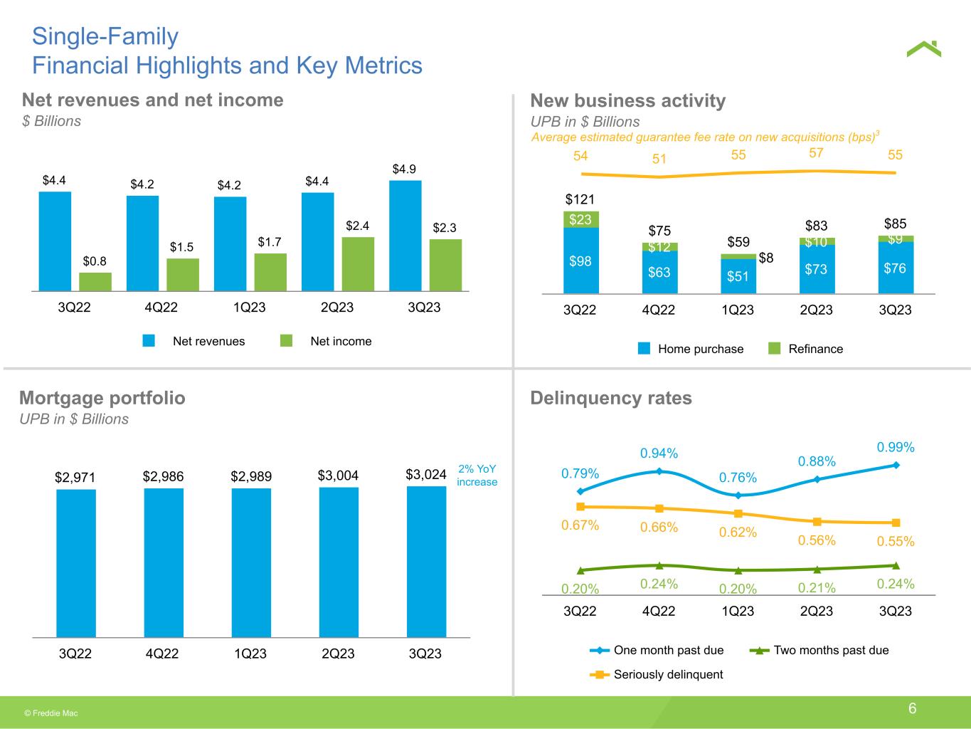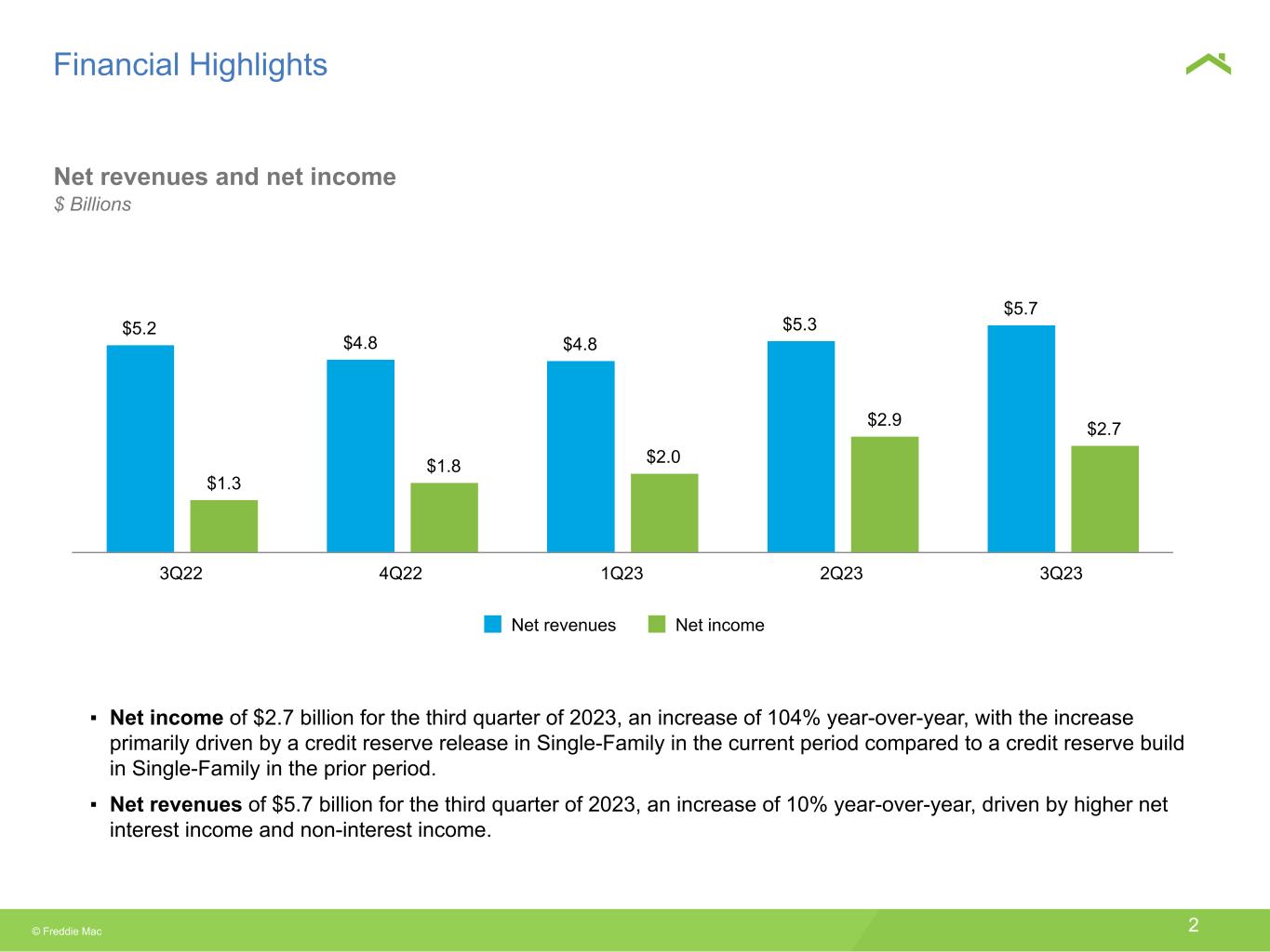 © Freddie Mac 2 Financial Highlights $5.2 $4.8 $4.8 $5.3 $5.7 $1.3 $1.8 $2.0 $2.9 $2.7 Net revenues Net income 3Q22 4Q22 1Q23 2Q23 3Q23 Net revenues and net income $ Billions ▪ Net income of $2.7 billion for the third quarter of 2023, an increase of 104% year-over-year, with the increase primarily driven by a credit reserve release in Single-Family in the current period compared to a credit reserve build in Single-Family in the prior period. ▪ Net revenues of $5.7 billion for the third quarter of 2023, an increase of 10% year-over-year, driven by higher net interest income and non-interest income.