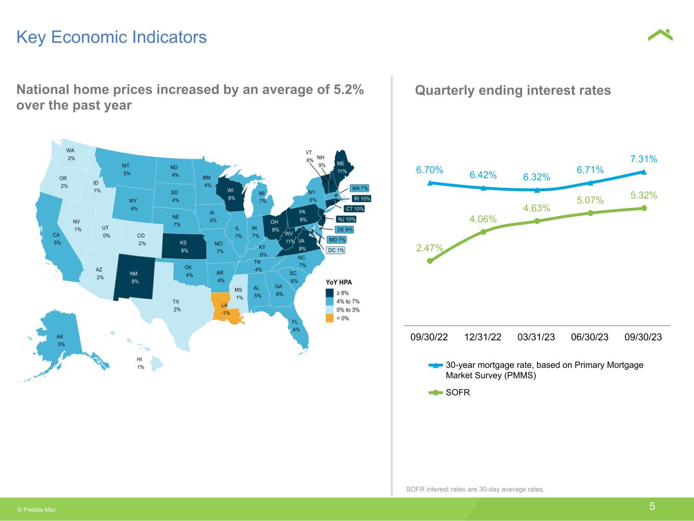 © Freddie Mac 4 $44.7 $114.6 $140.2 Net worth Senior preferred stock liquidation preference Remaining Treasury funding commitment As of September 30, 2023 Conservatorship Matters Pursuant to the Purchase Agreement, Freddie Mac will not be required to pay a dividend to Treasury until it has built sufficient capital to meet the capital requirements and buffers set forth in the Enterprise Regulatory Capital Framework (ERCF). Draws and dividend payments $ Billions Net worth, liquidation preference, and Treasury funding commitment $ Billions $71.6 $119.7 Cumulative draws from Treasury Cumulative dividend payments to Treasury As of September 30, 2023 2