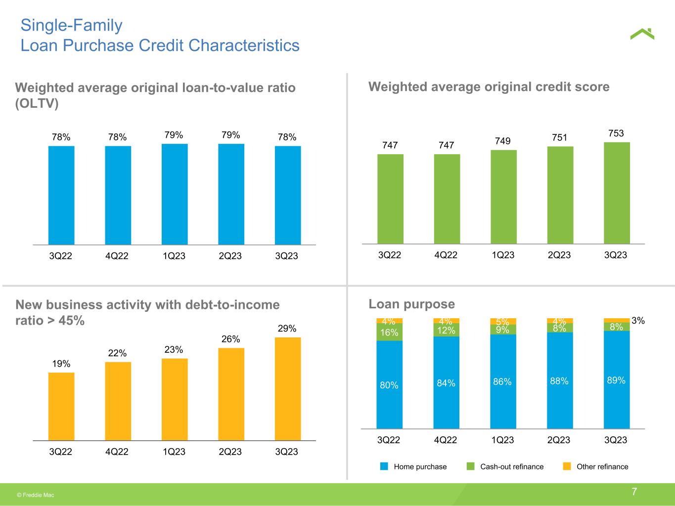 © Freddie Mac 6 $2,971 $2,986 $2,989 $3,004 $3,024 3Q22 4Q22 1Q23 2Q23 3Q23 0.79% 0.94% 0.76% 0.88% 0.99% 0.20% 0.24% 0.20% 0.21% 0.24% 0.67% 0.66% 0.62% 0.56% 0.55% One month past due Two months past due Seriously delinquent 3Q22 4Q22 1Q23 2Q23 3Q23 $121 $75 $59 $83 $85 $98 $63 $51 $73 $76 $23 $12 $10 $9 54 51 55 57 55 Home purchase Refinance 3Q22 4Q22 1Q23 2Q23 3Q23 Single-Family Financial Highlights and Key Metrics $4.4 $4.2 $4.2 $4.4 $4.9 $0.8 $1.5 $1.7 $2.4 $2.3 Net revenues Net income 3Q22 4Q22 1Q23 2Q23 3Q23 Net revenues and net income $ Billions 2% YoY increase Mortgage portfolio UPB in $ Billions Average estimated guarantee fee rate on new acquisitions (bps)3 Delinquency rates New business activity UPB in $ Billions $8