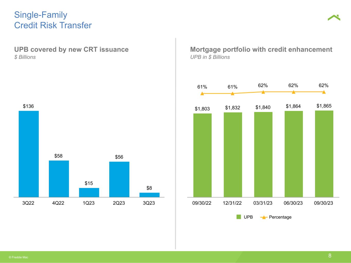© Freddie Mac 7 78% 78% 79% 79% 78% 3Q22 4Q22 1Q23 2Q23 3Q23 80% 84% 86% 88% 89% 16% 12% 9% 8% 8%4% 4% 5% 4% Home purchase Cash-out refinance Other refinance 3Q22 4Q22 1Q23 2Q23 3Q23 747 747 749 751 753 3Q22 4Q22 1Q23 2Q23 3Q23 19% 22% 23% 26% 29% 3Q22 4Q22 1Q23 2Q23 3Q23 New business activity with debt-to-income ratio > 45% Weighted average original loan-to-value ratio (OLTV) Weighted average original credit score Single-Family Loan Purchase Credit Characteristics Loan purpose 3%