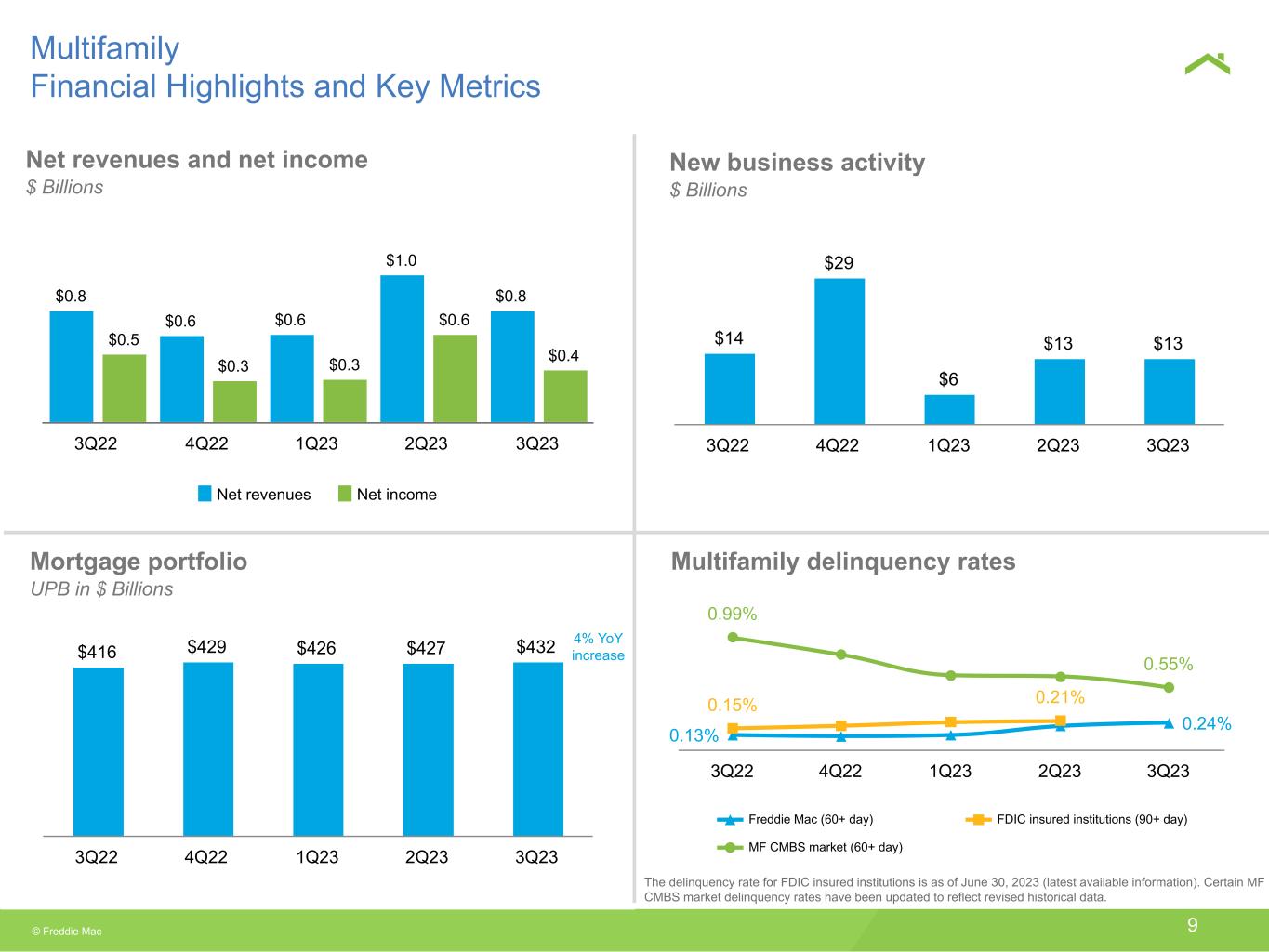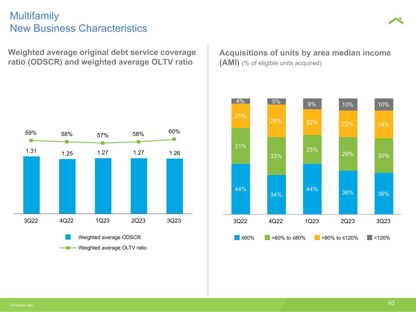 © Freddie Mac 9 $14 $29 $6 $13 $13 3Q22 4Q22 1Q23 2Q23 3Q23 0.13% 0.24% 0.15% 0.21% 0.99% 0.55% Freddie Mac (60+ day) FDIC insured institutions (90+ day) MF CMBS market (60+ day) 3Q22 4Q22 1Q23 2Q23 3Q23 Multifamily delinquency rates $416 $429 $426 $427 $432 3Q22 4Q22 1Q23 2Q23 3Q23 Multifamily Financial Highlights and Key Metrics $0.8 $0.6 $0.6 $1.0 $0.8 $0.5 $0.3 $0.3 $0.6 $0.4 Net revenues Net income 3Q22 4Q22 1Q23 2Q23 3Q23 (89 %) New business activity $ Billions 4% YoY increase The delinquency rate for FDIC insured institutions is as of June 30, 2023 (latest available information). Certain MF CMBS market delinquency rates have been updated to reflect revised historical data. Mortgage portfolio UPB in $ Billions Net revenues and net income $ Billions