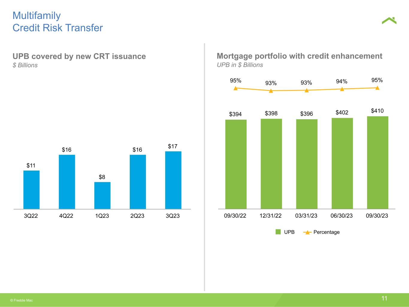 © Freddie Mac 10 Acquisitions of units by area median income (AMI) (% of eligible units acquired) 44% 34% 44% 38% 36% 31% 33% 25% 29% 30% 21% 28% 22% 23% 24% 4% 5% 9% 10% 10% ≤60% >60% to ≤80% >80% to ≤120% >120% 3Q22 4Q22 1Q23 2Q23 3Q23 1.31 1.25 1.27 1.27 1.26 59% 58% 57% 58% 60% Weighted average ODSCR Weighted average OLTV ratio 3Q22 4Q22 1Q23 2Q23 3Q23 Multifamily New Business Characteristics (89 %) Weighted average original debt service coverage ratio (ODSCR) and weighted average OLTV ratio