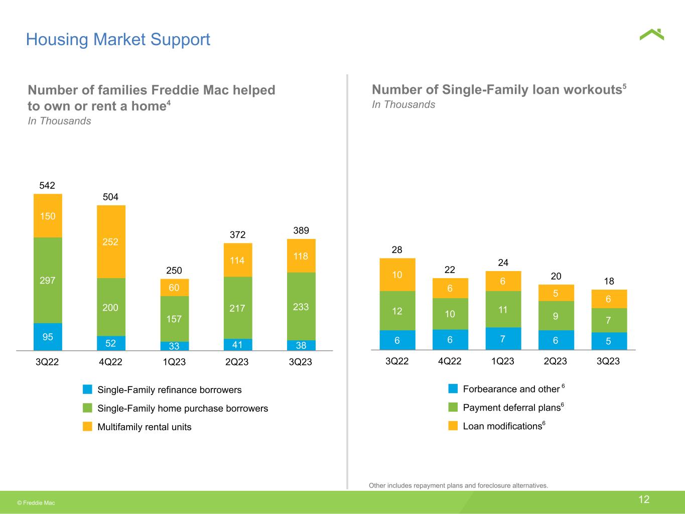 © Freddie Mac 11 $394 $398 $396 $402 $410 95% 93% 93% 94% 95% UPB Percentage 09/30/22 12/31/22 03/31/23 06/30/23 09/30/23 Mortgage portfolio with credit enhancement UPB in $ Billions $11 $16 $8 $16 $17 3Q22 4Q22 1Q23 2Q23 3Q23 Multifamily Credit Risk Transfer UPB covered by new CRT issuance $ Billions