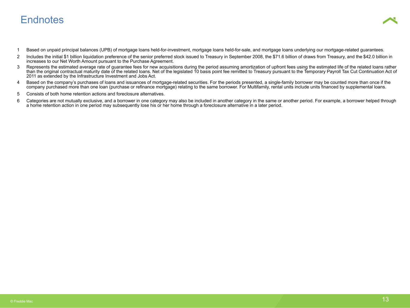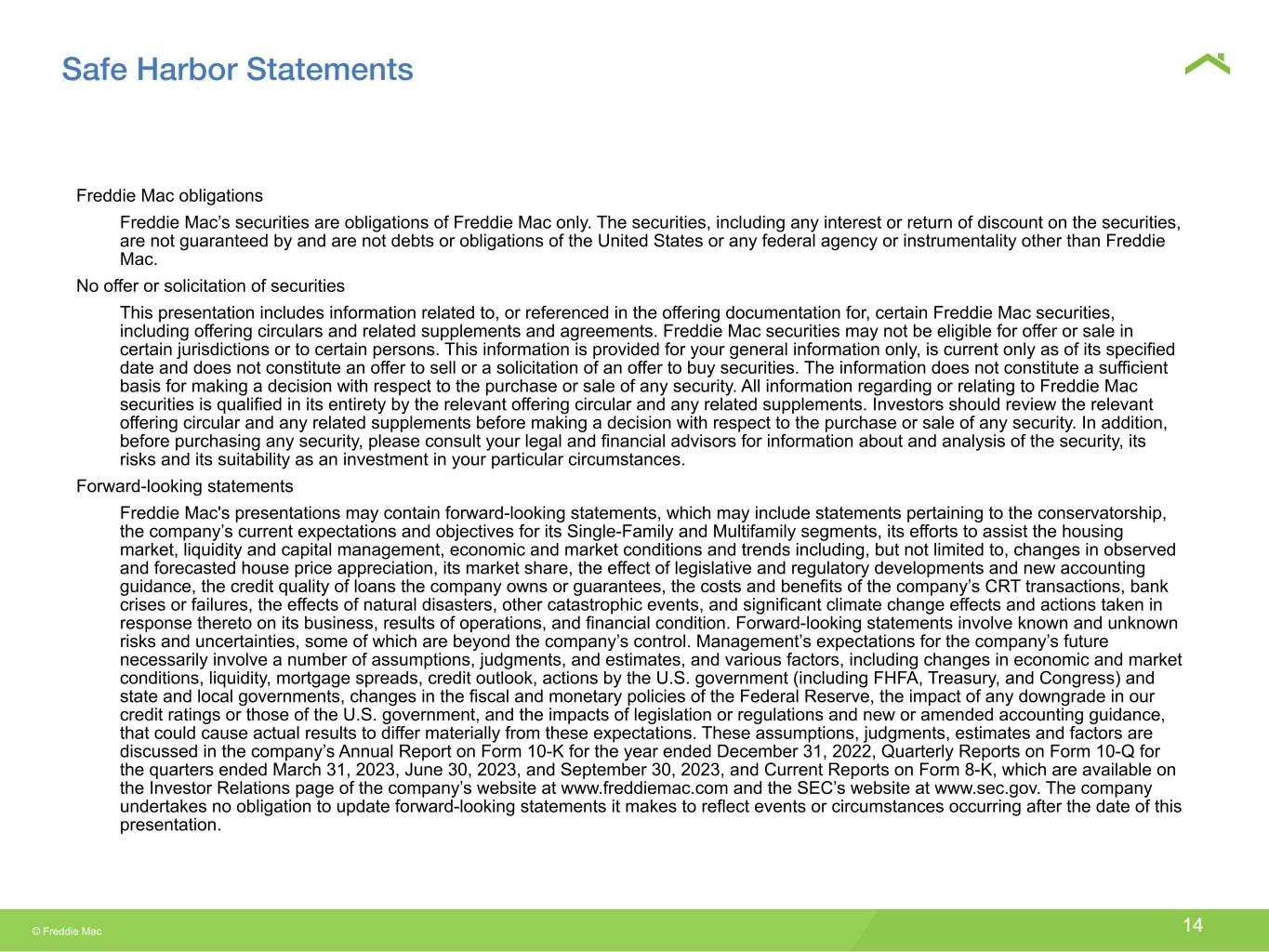 © Freddie Mac 13 Endnotes 1 Based on unpaid principal balances (UPB) of mortgage loans held-for-investment, mortgage loans held-for-sale, and mortgage loans underlying our mortgage-related guarantees. 2 Includes the initial $1 billion liquidation preference of the senior preferred stock issued to Treasury in September 2008, the $71.6 billion of draws from Treasury, and the $42.0 billion in increases to our Net Worth Amount pursuant to the Purchase Agreement. 3 Represents the estimated average rate of guarantee fees for new acquisitions during the period assuming amortization of upfront fees using the estimated life of the related loans rather than the original contractual maturity date of the related loans. Net of the legislated 10 basis point fee remitted to Treasury pursuant to the Temporary Payroll Tax Cut Continuation Act of 2011 as extended by the Infrastructure Investment and Jobs Act. 4 Based on the company’s purchases of loans and issuances of mortgage-related securities. For the periods presented, a single-family borrower may be counted more than once if the company purchased more than one loan (purchase or refinance mortgage) relating to the same borrower. For Multifamily, rental units include units financed by supplemental loans. 5 Consists of both home retention actions and foreclosure alternatives. 6 Categories are not mutually exclusive, and a borrower in one category may also be included in another category in the same or another period. For example, a borrower helped through a home retention action in one period may subsequently lose his or her home through a foreclosure alternative in a later period.
