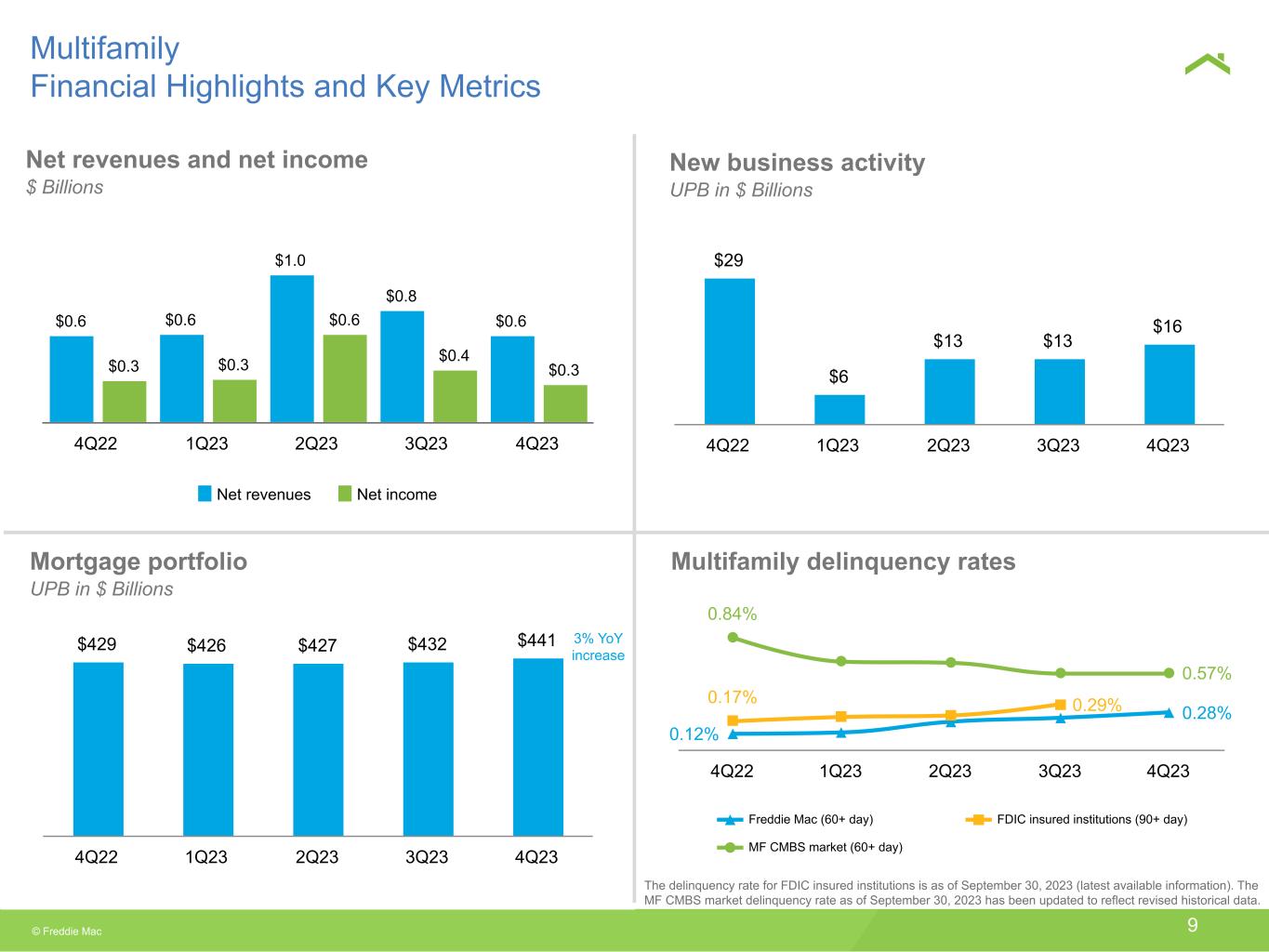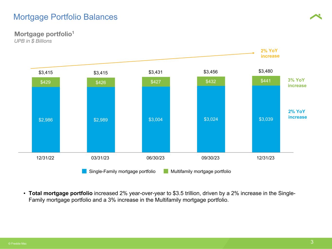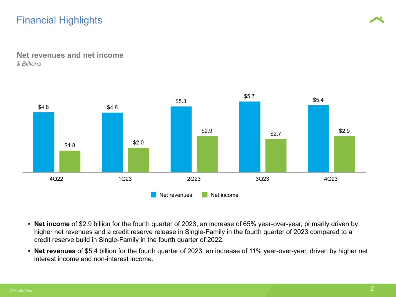 © Freddie Mac 2 Financial Highlights $4.8 $4.8 $5.3 $5.7 $5.4 $1.8 $2.0 $2.9 $2.7 $2.9 Net revenues Net income 4Q22 1Q23 2Q23 3Q23 4Q23 Net revenues and net income $ Billions ▪ Net income of $2.9 billion for the fourth quarter of 2023, an increase of 65% year-over-year, primarily driven by higher net revenues and a credit reserve release in Single-Family in the fourth quarter of 2023 compared to a credit reserve build in Single-Family in the fourth quarter of 2022. ▪ Net revenues of $5.4 billion for the fourth quarter of 2023, an increase of 11% year-over-year, driven by higher net interest income and non-interest income.