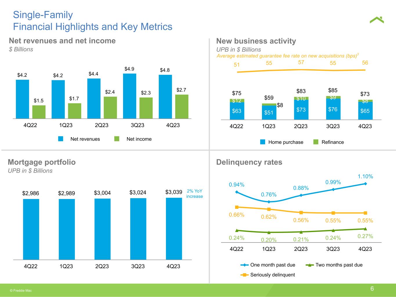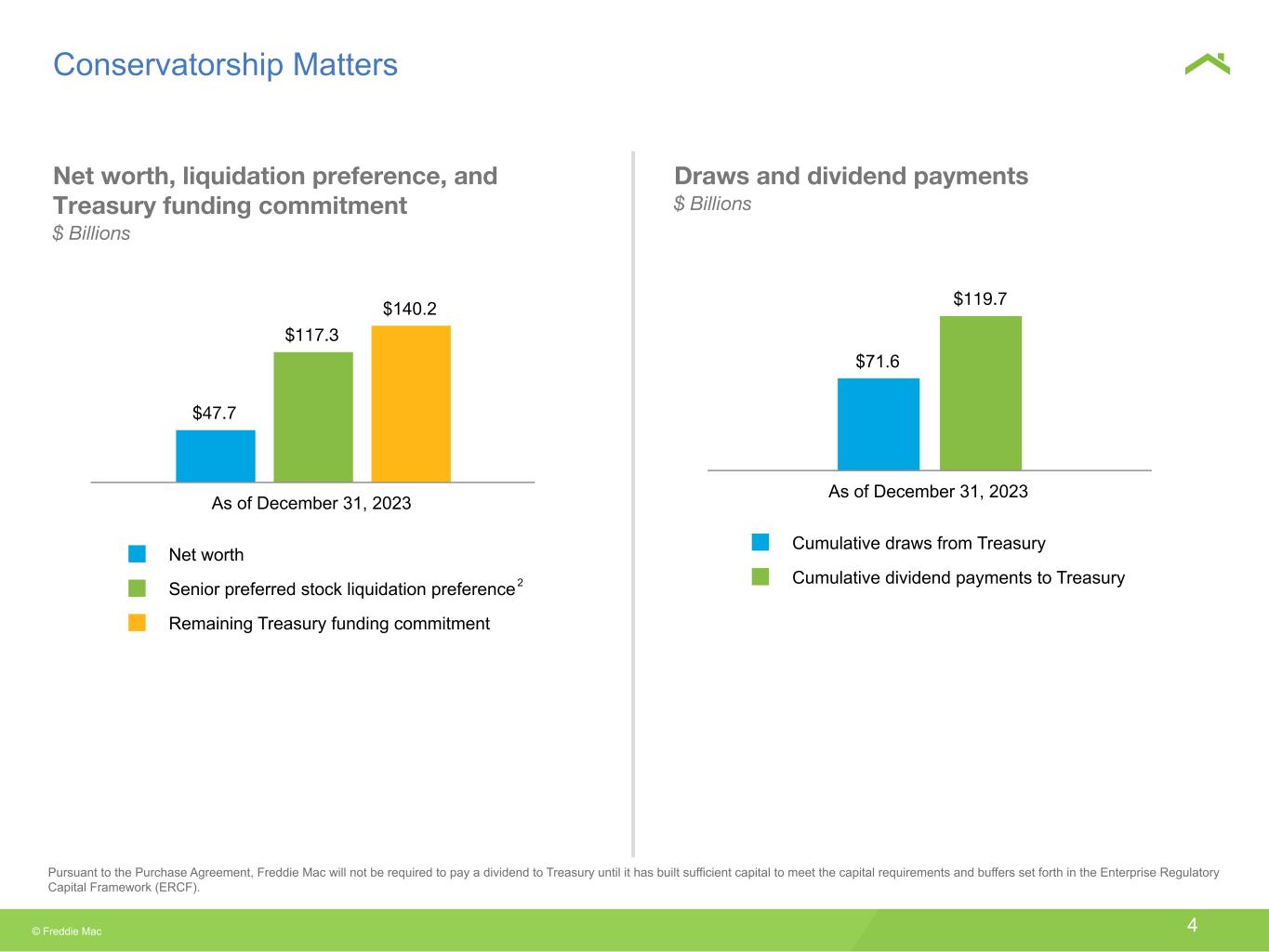 © Freddie Mac 3 $3,415 $3,415 $3,431 $3,456 $3,480 $2,986 $2,989 $3,004 $3,024 $3,039 $429 $426 $427 $432 $441 Single-Family mortgage portfolio Multifamily mortgage portfolio 12/31/22 03/31/23 06/30/23 09/30/23 12/31/23 Mortgage Portfolio Balances Mortgage portfolio1 UPB in $ Billions 2% YoY increase 3% YoY increase 2% YoY increase ▪ Total mortgage portfolio increased 2% year-over-year to $3.5 trillion, driven by a 2% increase in the Single- Family mortgage portfolio and a 3% increase in the Multifamily mortgage portfolio.
