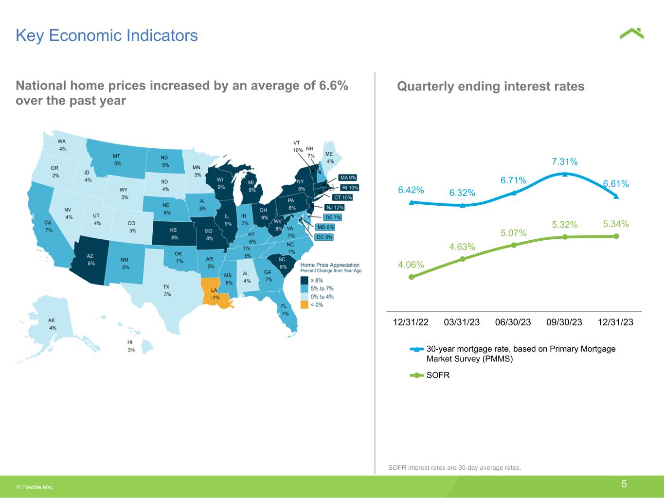 © Freddie Mac 5 National home prices increased by an average of 6.6% over the past year 6.42% 6.32% 6.71% 7.31% 6.61% 4.06% 4.63% 5.07% 5.32% 5.34% 30-year mortgage rate, based on Primary Mortgage Market Survey (PMMS) SOFR 12/31/22 03/31/23 06/30/23 09/30/23 12/31/23 Key Economic Indicators Quarterly ending interest rates SOFR interest rates are 30-day average rates.