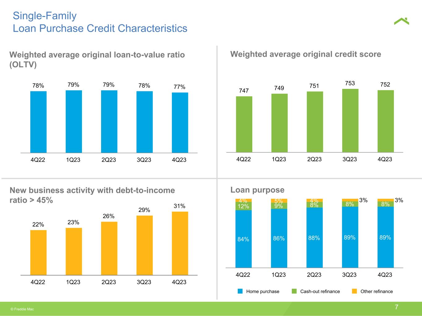 © Freddie Mac 6 $2,986 $2,989 $3,004 $3,024 $3,039 4Q22 1Q23 2Q23 3Q23 4Q23 0.94% 0.76% 0.88% 0.99% 1.10% 0.24% 0.20% 0.21% 0.24% 0.27% 0.66% 0.62% 0.56% 0.55% 0.55% One month past due Two months past due Seriously delinquent 4Q22 1Q23 2Q23 3Q23 4Q23 $75 $59 $83 $85 $73 $63 $51 $73 $76 $65 $12 $10 $9 $8 51 55 57 55 56 Home purchase Refinance 4Q22 1Q23 2Q23 3Q23 4Q23 Single-Family Financial Highlights and Key Metrics $4.2 $4.2 $4.4 $4.9 $4.8 $1.5 $1.7 $2.4 $2.3 $2.7 Net revenues Net income 4Q22 1Q23 2Q23 3Q23 4Q23 Net revenues and net income $ Billions 2% YoY increase Mortgage portfolio UPB in $ Billions Average estimated guarantee fee rate on new acquisitions (bps)3 Delinquency rates New business activity UPB in $ Billions $8