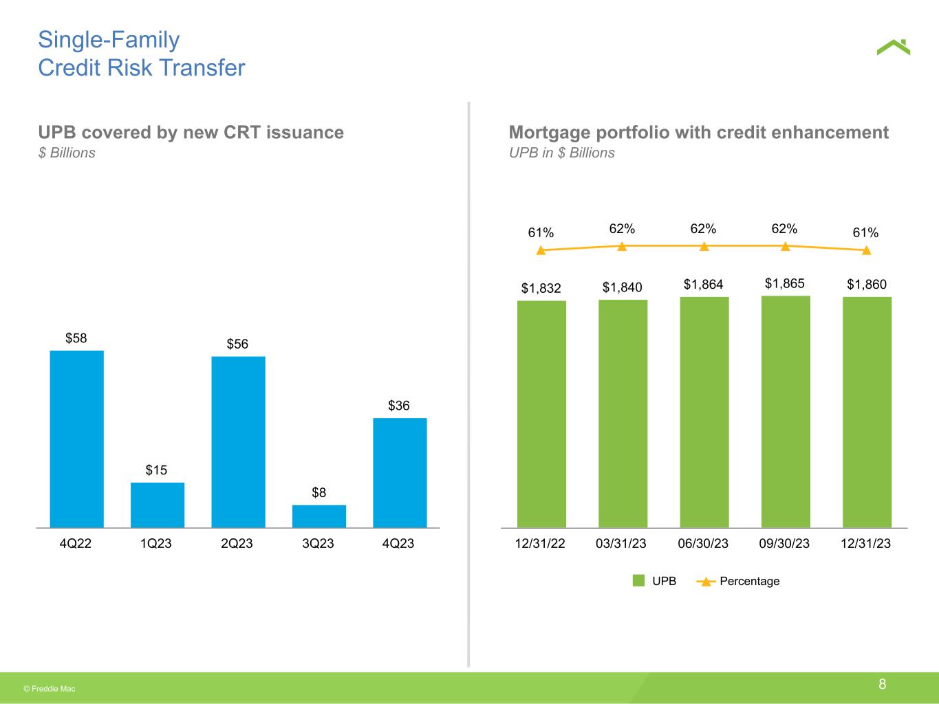 © Freddie Mac 7 Loan purpose 78% 79% 79% 78% 77% 4Q22 1Q23 2Q23 3Q23 4Q23 84% 86% 88% 89% 89% 12% 9% 8% 8% 8%4% 5% 4% Home purchase Cash-out refinance Other refinance 4Q22 1Q23 2Q23 3Q23 4Q23 747 749 751 753 752 4Q22 1Q23 2Q23 3Q23 4Q23 22% 23% 26% 29% 31% 4Q22 1Q23 2Q23 3Q23 4Q23 New business activity with debt-to-income ratio > 45% Weighted average original loan-to-value ratio (OLTV) Weighted average original credit score Single-Family Loan Purchase Credit Characteristics 3% 3%