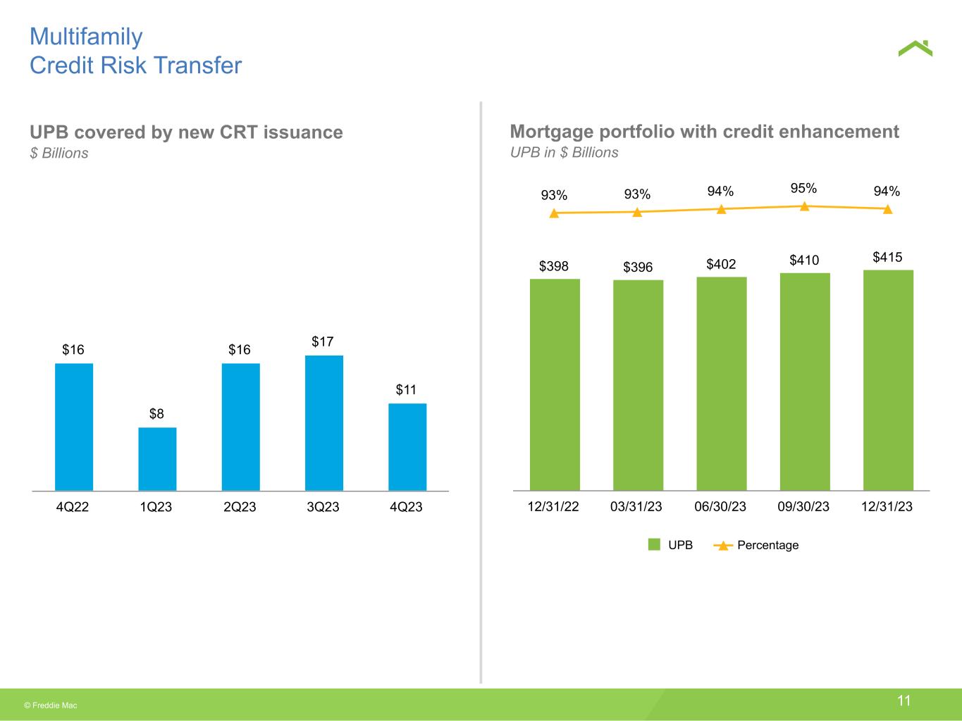 © Freddie Mac 10 Acquisitions of units by area median income (AMI) (% of eligible units acquired) 34% 44% 38% 36% 38% 33% 25% 29% 30% 29% 28% 22% 23% 24% 27% 5% 9% 10% 10% 6% ≤60% >60% to ≤80% >80% to ≤120% >120% 4Q22 1Q23 2Q23 3Q23 4Q23 1.25 1.27 1.27 1.26 1.27 58% 57% 58% 60% 59% Weighted average ODSCR Weighted average OLTV ratio 4Q22 1Q23 2Q23 3Q23 4Q23 Multifamily New Business Characteristics (89 %) Weighted average original debt service coverage ratio (ODSCR) and weighted average OLTV ratio