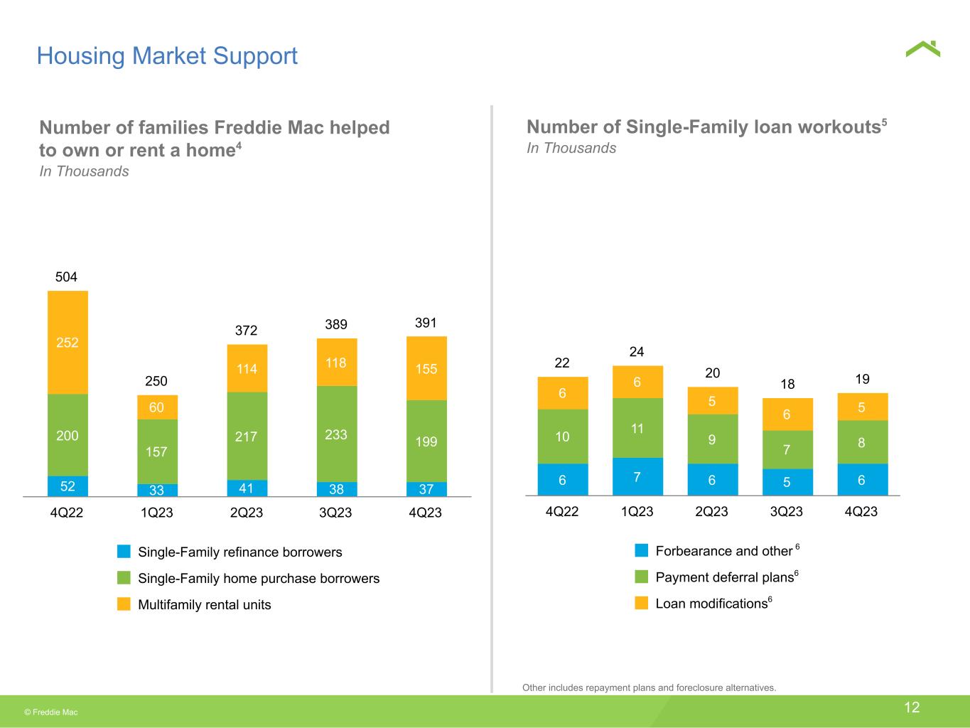 © Freddie Mac 12 22 24 20 18 19 6 7 6 5 6 10 11 9 7 8 6 6 5 6 5 Forbearance and other Payment deferral plans Loan modifications 4Q22 1Q23 2Q23 3Q23 4Q23 Number of families Freddie Mac helped to own or rent a home4 In Thousands Housing Market Support 504 250 372 389 52 33 41 38 37 200 157 217 233 199 252 60 114 118 155 Single-Family refinance borrowers Single-Family home purchase borrowers Multifamily rental units 4Q22 1Q23 2Q23 3Q23 4Q23 Other includes repayment plans and foreclosure alternatives. 6 Number of Single-Family loan workouts5 In Thousands 6 6 391