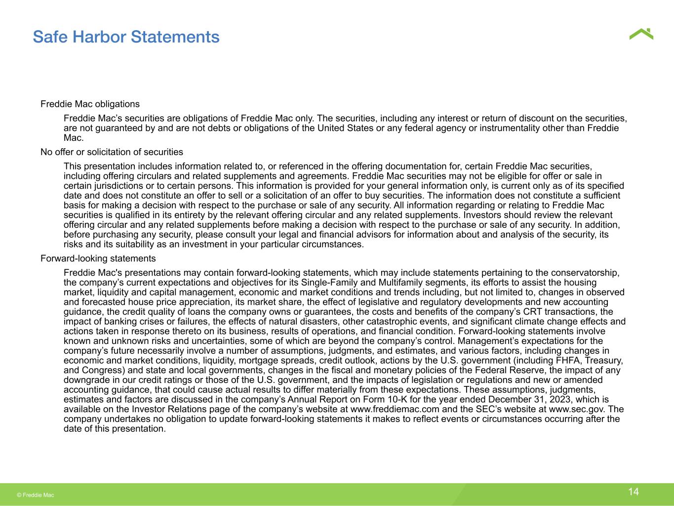 © Freddie Mac 13 Endnotes 1 Based on unpaid principal balances (UPB) of mortgage loans held-for-investment, mortgage loans held-for-sale, and mortgage loans underlying our mortgage-related guarantees. 2 Includes the initial $1 billion liquidation preference of the senior preferred stock issued to Treasury in September 2008, the $71.6 billion of draws from Treasury, and the $44.7 billion in increases to our Net Worth Amount pursuant to the Purchase Agreement. 3 Represents the estimated average rate of guarantee fees for new acquisitions during the period assuming amortization of upfront fees using the estimated life of the related loans rather than the original contractual maturity date of the related loans. Net of the legislated 10 basis point fee remitted to Treasury pursuant to the Temporary Payroll Tax Cut Continuation Act of 2011 as extended by the Infrastructure Investment and Jobs Act. 4 Based on the company’s purchases of loans and issuances of mortgage-related securities. For the periods presented, a single-family borrower may be counted more than once if the company purchased more than one loan (purchase or refinance mortgage) relating to the same borrower. For Multifamily, rental units include units financed by supplemental loans. 5 Consists of both home retention actions and foreclosure alternatives. 6 Categories are not mutually exclusive, and a borrower in one category may also be included in another category in the same or another period. For example, a borrower helped through a home retention action in one period may subsequently lose his or her home through a foreclosure alternative in a later period.