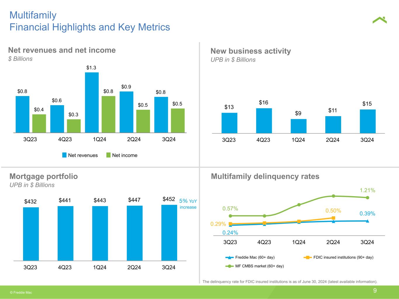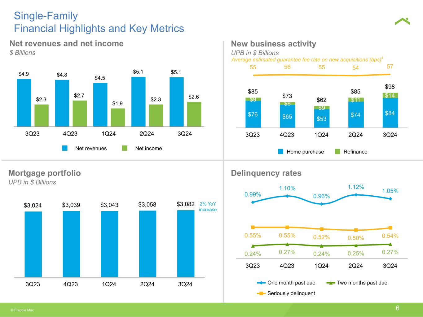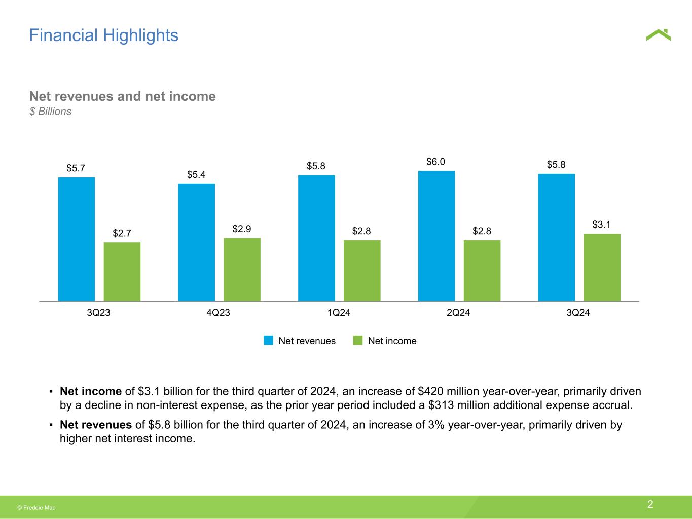 © Freddie Mac 2 Financial Highlights $5.7 $5.4 $5.8 $6.0 $5.8 $2.7 $2.9 $2.8 $2.8 $3.1 Net revenues Net income 3Q23 4Q23 1Q24 2Q24 3Q24 Net revenues and net income $ Billions ▪ Net income of $3.1 billion for the third quarter of 2024, an increase of $420 million year-over-year, primarily driven by a decline in non-interest expense, as the prior year period included a $313 million additional expense accrual. ▪ Net revenues of $5.8 billion for the third quarter of 2024, an increase of 3% year-over-year, primarily driven by higher net interest income.