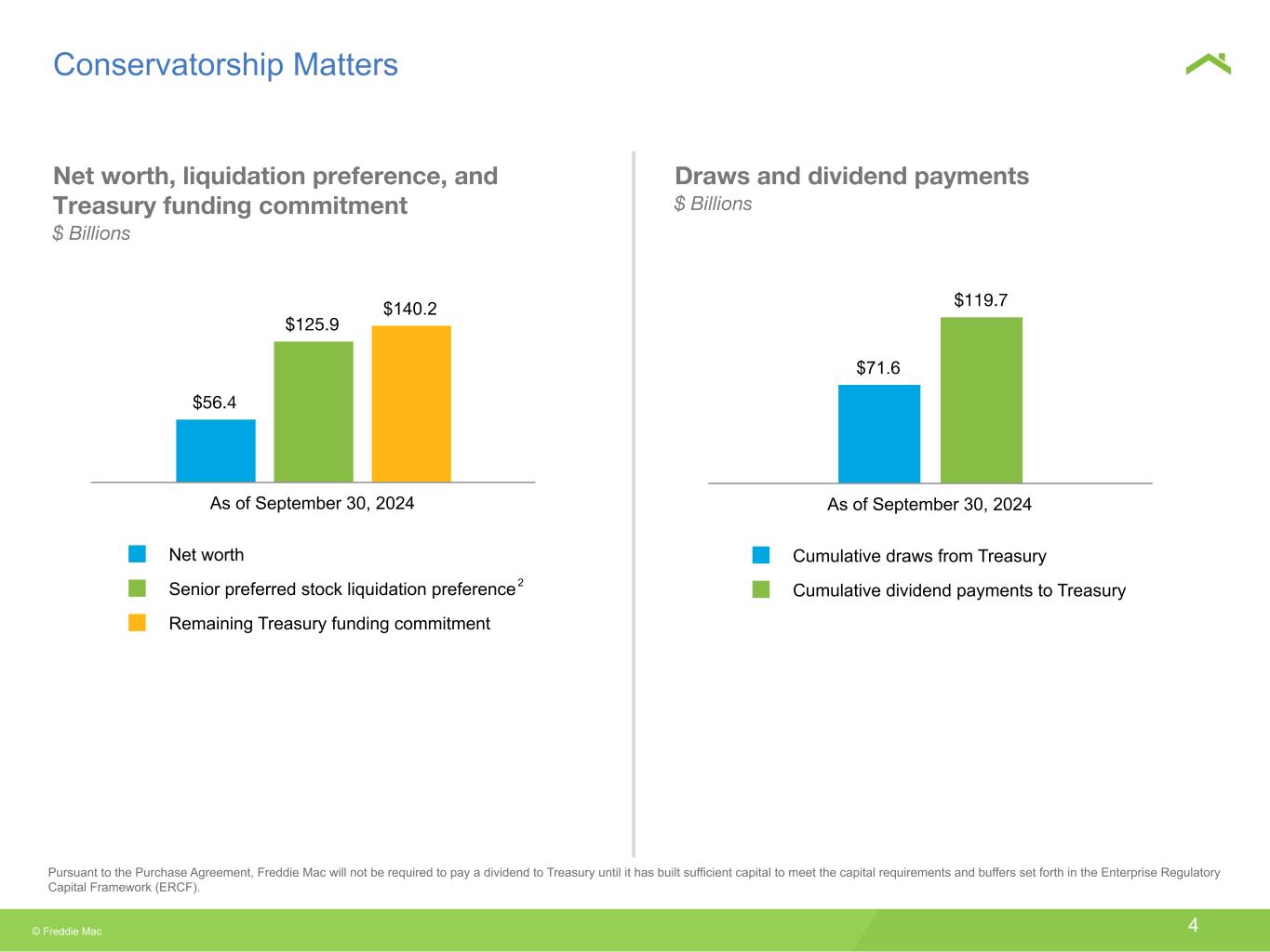 © Freddie Mac 4 $56.4 $125.9 $140.2 Net worth Senior preferred stock liquidation preference Remaining Treasury funding commitment As of September 30, 2024 Conservatorship Matters Pursuant to the Purchase Agreement, Freddie Mac will not be required to pay a dividend to Treasury until it has built sufficient capital to meet the capital requirements and buffers set forth in the Enterprise Regulatory Capital Framework (ERCF). Draws and dividend payments $ Billions Net worth, liquidation preference, and Treasury funding commitment $ Billions $71.6 $119.7 Cumulative draws from Treasury Cumulative dividend payments to Treasury As of September 30, 2024 2