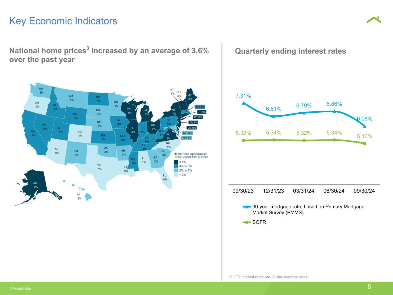 © Freddie Mac 5 National home prices3 increased by an average of 3.6% over the past year 7.31% 6.61% 6.79% 6.86% 6.08% 5.32% 5.34% 5.32% 5.34% 5.16% 30-year mortgage rate, based on Primary Mortgage Market Survey (PMMS) SOFR 09/30/23 12/31/23 03/31/24 06/30/24 09/30/24 Key Economic Indicators Quarterly ending interest rates SOFR interest rates are 30-day average rates.